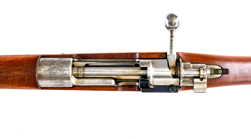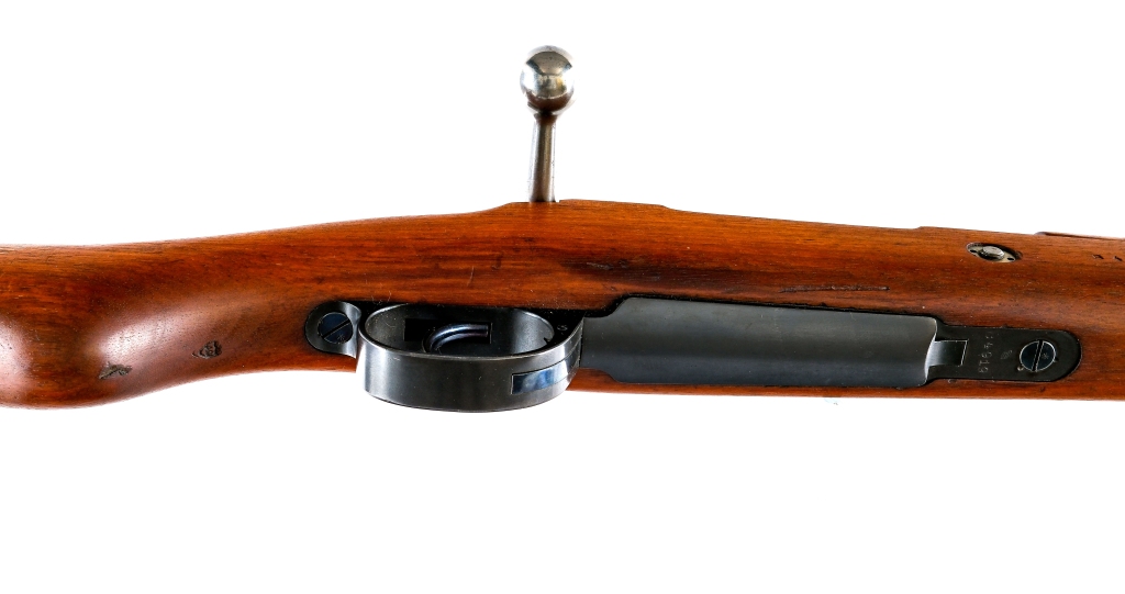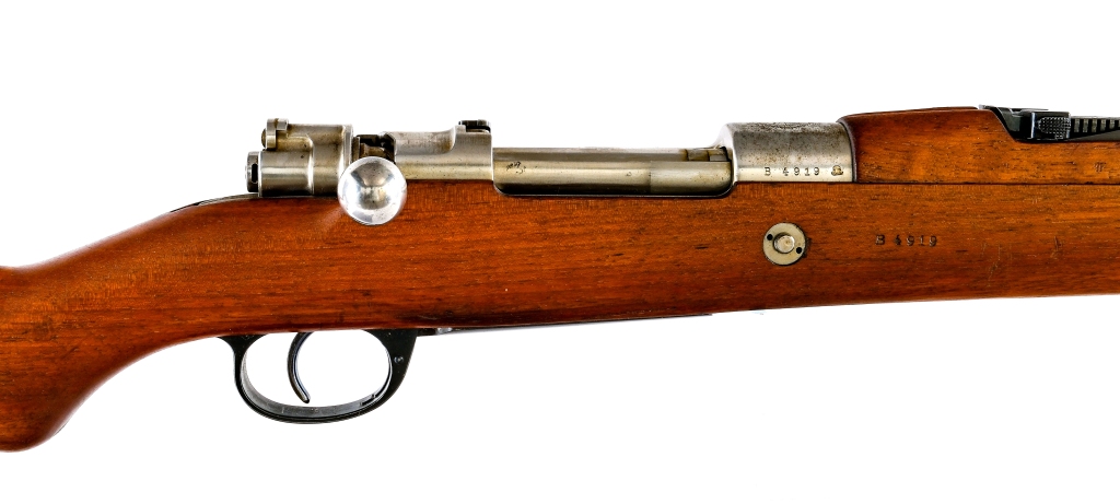 Description DWM Argentine Mauser Modelo 1909 chambered in 7.65x53mm Argentine with a five round integral magazine and a 29.1″ barrel. Front cleaning rod and bayonet lug. Unfinished bolt with flag style safety. Adjustable rear tangent leaf sight and fixed front blade. Unfinished receiver. Blued finish with smooth wood forend and pistol grip stock with metal butt plate. Front and rear sling swivels. Serial number matching receiver, bolt, floor plate, cleaning rod, and stock. The left side of the frame is marked “MAUSER-MODELO ARGENTINO 1909”, “DEUTCHE WAFFEN-UND, MUNITIONSFABRIKEN BERLIN”. Comes with non matching brass muzzle cover. Must ship to a FFL or C&R holder. Condition: Very Good with scratches, sharp edge wear, and general cosmetic handling wear. Some spots of finish thinning and patina Some scratches and dings in the wood. Bore has possibly been sanded and refinished at some point. The markings on the metal and wood are crisp and visible. Bright and clean bore with strong rifling. Barrel Length: 29.1″ Serial: B4919 Manufacturer: DWM Caliber: 7.65x53mm Argentine Model: Mauser 1909 Book# 07778
