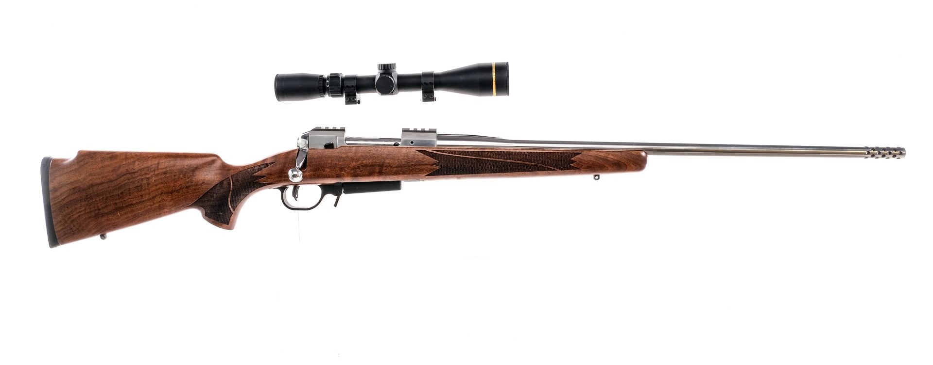 Description E.R. Shaw Mk.X chambered in 6mm Norma BR with one, five round removable magazine and a 24″ polished stainless contoured barrel and integral muzzle break. Polished/matte stainless receiver and bolt. Three position tang mounted safety selector. Fully adjustable trigger and paddle magazine release. Diamond checkered nutmeg laminate Monte Carlo style stock with rubber butt pad. The receiver has two short rails for mounting scope rings. Front and rear sling eyelets. Comes with a Leupold VX-Freedom 3-9×40 scope and one magazine. Must ship to FFL holder. Condition: Very good/Excellent with light wear from normal handling and operation. Clean bore with strong rifling. Barrel Length: 24″ Serial: CHB000124 Manufacturer: E.R. SHAW INC. Caliber: 6MM Norma BR Model: Mk-X Book# 01967