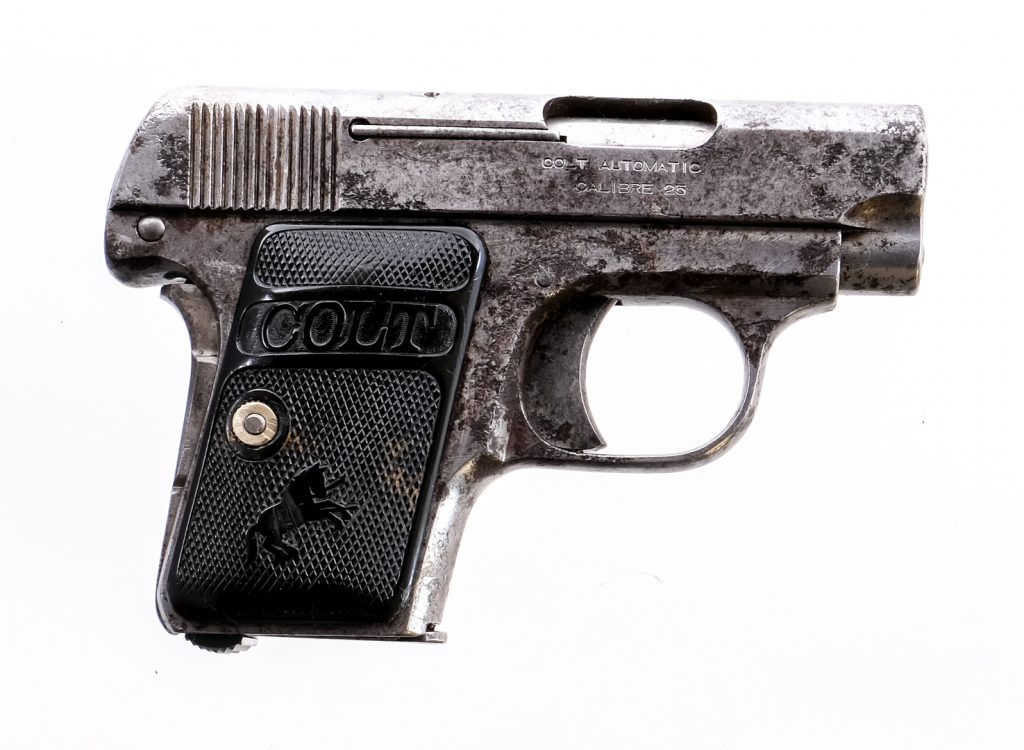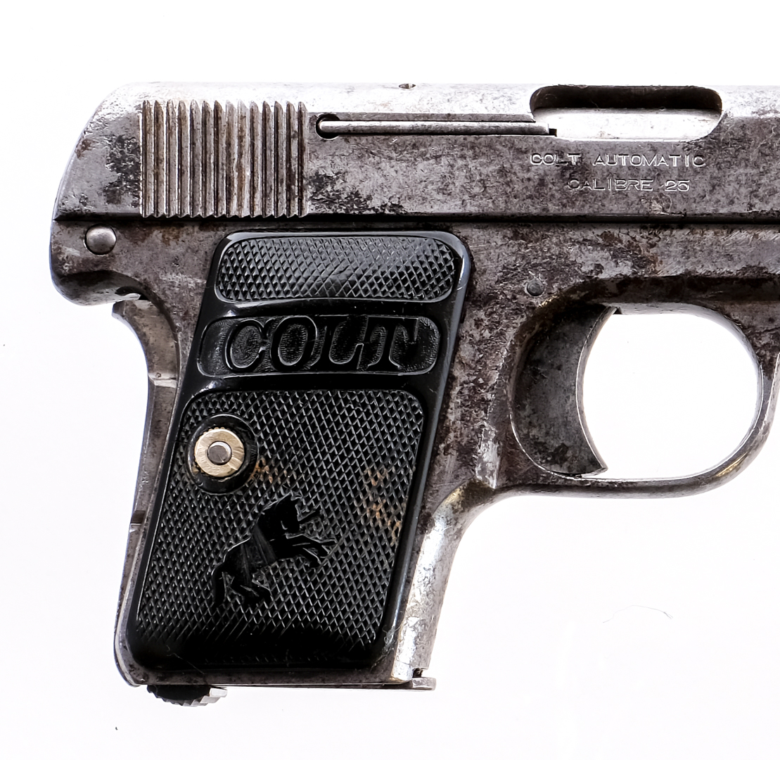 Description Colt Model 1908 Vest Pocket in .25 ACP with one, six round removable magazine and a 2″ barrel. Checkered black composite grip plates. Finish worn metal frame, solid trigger, serrated slide and barrel. Backstrap safety. Left side of frame checkered slide stop safety. Front and rear fixed sights. Must ship to a C&R or FFL holder. Condition: Fair with heavy finish wear/loss, rust and light pitting. Clean rifled bore. Barrel Length: 2″ Serial: 124521 Manufacturer: Colt Year: 1915 Caliber: .25 ACP Model: 1908 Vest Pocket Book# 9-751