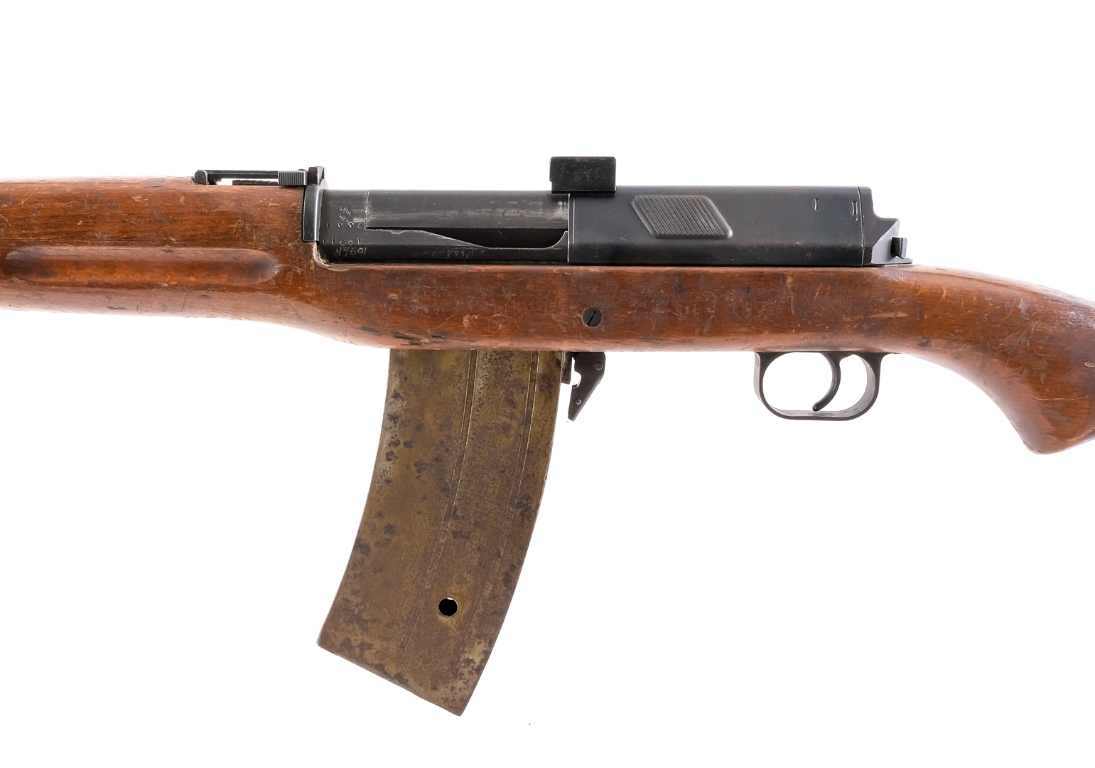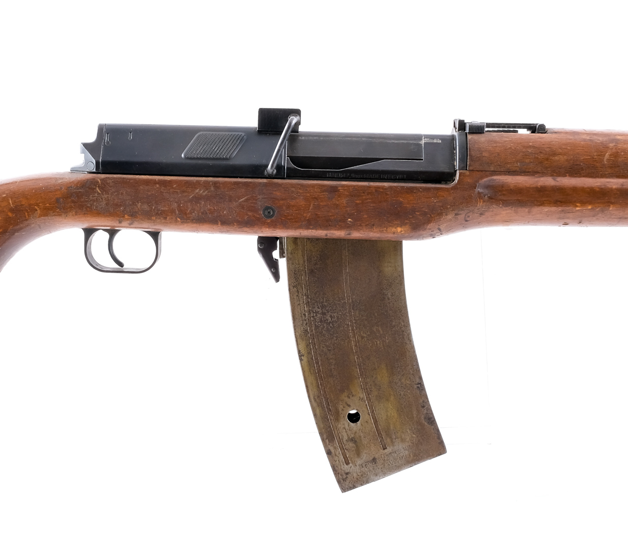 Description Egyptian Hakim Rifle in 7.92x57mm (8mm Mauser) with one, thirty round removable aftermarket magazine and a 25.5″ barrel with muzzle brake. Import marked on barrel by C.A.I. out of Vermont. Metal butt plate. Smooth wood stock and front forend. Blued trigger guard, untextured trigger, receiver and barrel. Magwell located magazine release lever. Right side receiver charging handle. Rear receiver safety switch. Under barrel fixed bayonet lug. Left side of rifle metal loops for mounting a shoulder sling. Rear flip up adjustable and front hooded fixed blade sight. Stock is painted with VL. and yellow paint square. Magazine made by Federal Arms INC. Check Local/State Laws on HIGH CAPACITY magazines before bidding. Must ship to a C&R or FFL holder. Condition: Good/Very good with scratches, wood dings and touches of metal oxidation. The aftermarket magazine has significant rust. Clean rifled bore. Barrel Length: 25.5″ Serial: 44501 Manufacturer: Egypt Caliber: 7.92x57mm Model: Hakim Rifle Year-Range 1950-1970