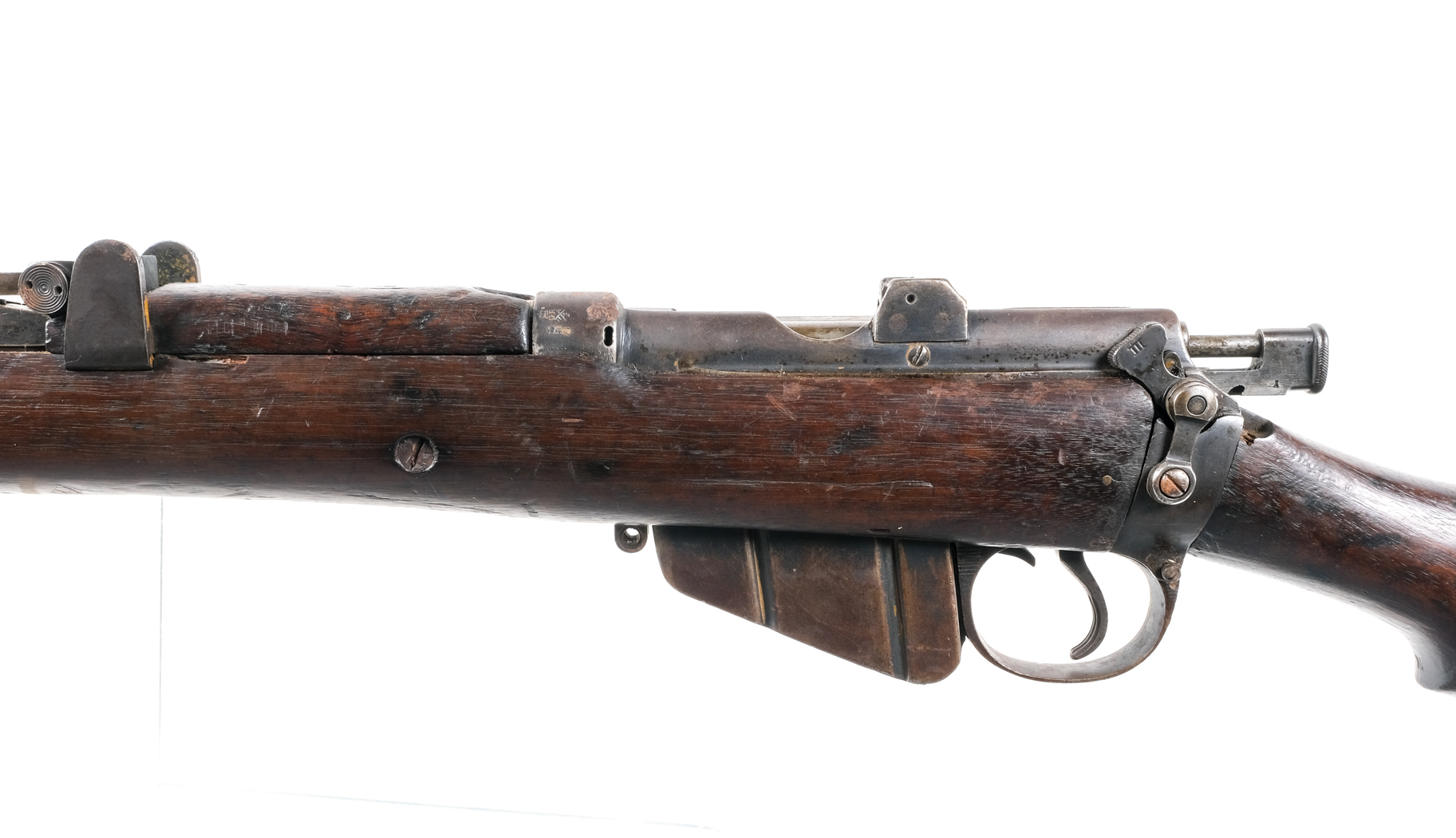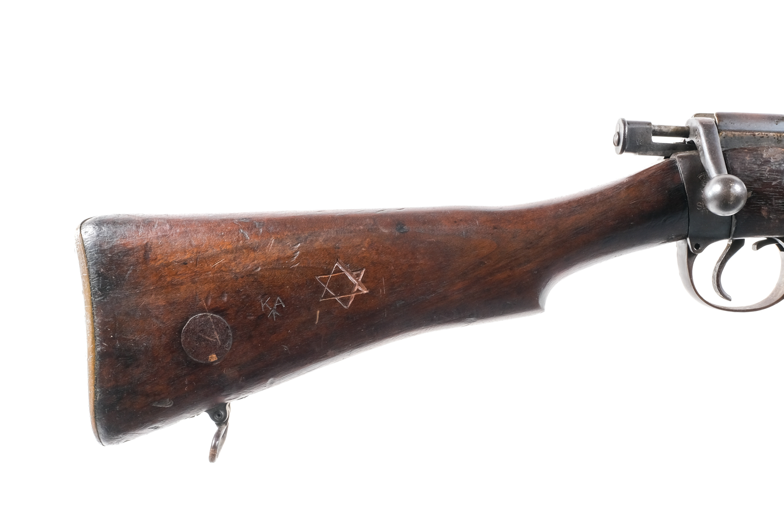 Description Enfield SHTLE III in .303 caliber with one, ten round removable magazine and a 25.5″ barrel. Brass butt plate with cleaning kit door, empty. Smooth wood stock and front forend. Blued trigger guard, serrated trigger, receiver, bolt and barrel. Left side of receiver safety switch. Inside trigger guard located magazine release. Under barrel fixed bayonet lug. Rear flip up adjustable and front fixed blade sight. All visible numbers are matching. A Jewish Star Of David and KA up arrow is carved into the right side of butt stock. Must ship to a C&R or FFL holder. Condition: Good with scratches, wood dings and touches of rust. Clean rifled bore. Barrel Length: 25.5″ Serial: E7596 Manufacturer: United Kingdom Standard S Year: 1917 Caliber: .303 Model: SHTLE III Book# 9-417