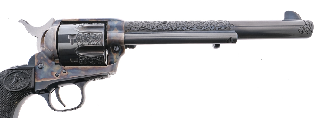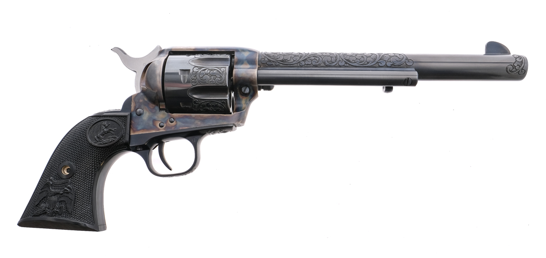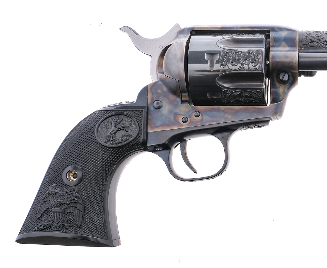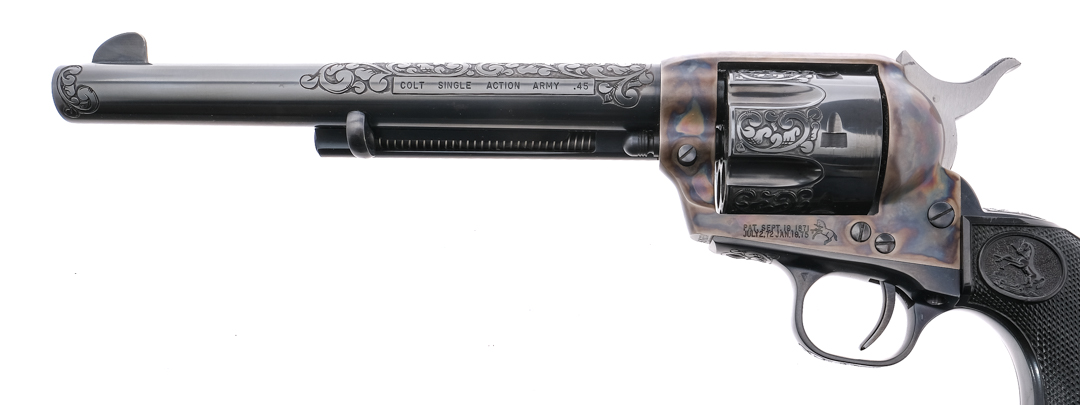 Description Colt Single Action Army in .45 Long Colt with a six round capacity and a 7.5″ barrel. Checkered composite grip plates. Engraved blued trigger guard, cylinder and barrel. Blued trigger and checkered hammer. Case colored frame. Right side of frame loading gate. Under barrel cylinder release pin and extractor rod. Front fixed blade sight. Must ship to a FFL holder. Condition: Excellent Plus with light scuffs and handling wear. A small spot of finish wear on the left side of barrel. Barrel Length: 7.5″ Serial: 96166SA Manufacturer: Colt Year: 1978 Caliber: .45 LC Model: SAA Book# 10-549