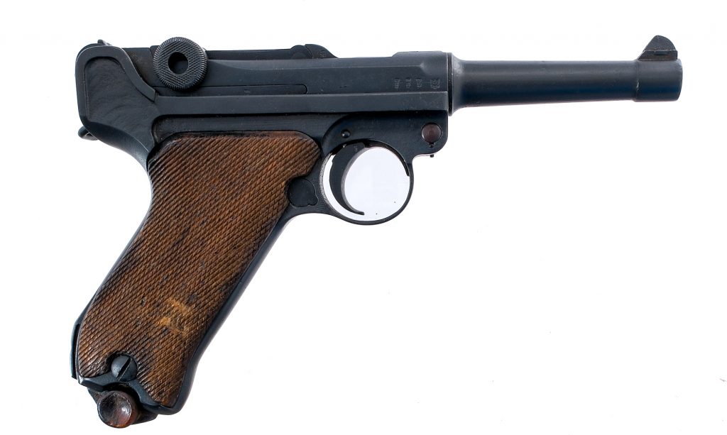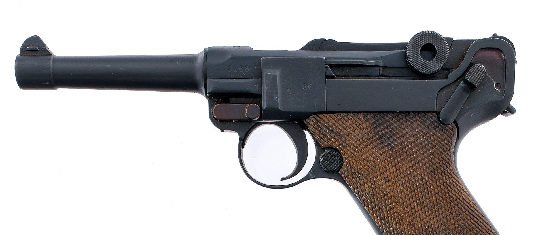 Description Erfurt 1914 Pattern Military Luger chambered in 9mm with one, non matching magazine with wood base plate, and a 4″ barrel. Manufactured in 1917 (marked on top of the chamber) with serial number 3466h. Refinished frame with stock lug, narrow trigger guard, and push button magazine release. Black refinished takedown lever, wide trigger, and serrated thumb safety marked “GESICHERT”. Matching checkered walnut grips. Black refinished barrel, chamber, and toggle with flat checkered toggle knobs. Front fixed “dorsal fin” blade and rear V notch iron sights. The toggle is marked with “ERFURT”. Inspection/Acceptance mark on the right side of the receiver. Proof marks on the barrel, receiver, extractor, front/rear of the toggle, side plate, and other small parts. Appears to be mostly matching aside from the magazine and a take down lever. Must ship to FFL or C&R holder. Condition: Fair as being totally refinished including the straw parts. Varying metal oxidation and pitting underneath the finish on most metal parts. Some metal oxidation on the frame below the grips. Some deep scratches on the side of the receiver by and under the acceptance proofs. The grips are worn with some scratches and scuffs. Some excess oil on some of the parts. Pitting/metal oxidation in the bore with fair visible rifling. The magazine body is also refinished. Barrel Length: 4″ Serial: 3466h Manufacturer: Erfurt Year: 1917 Caliber: 9x19mm Parabellum Model: 1914 Military P08 Luger Book# 02351