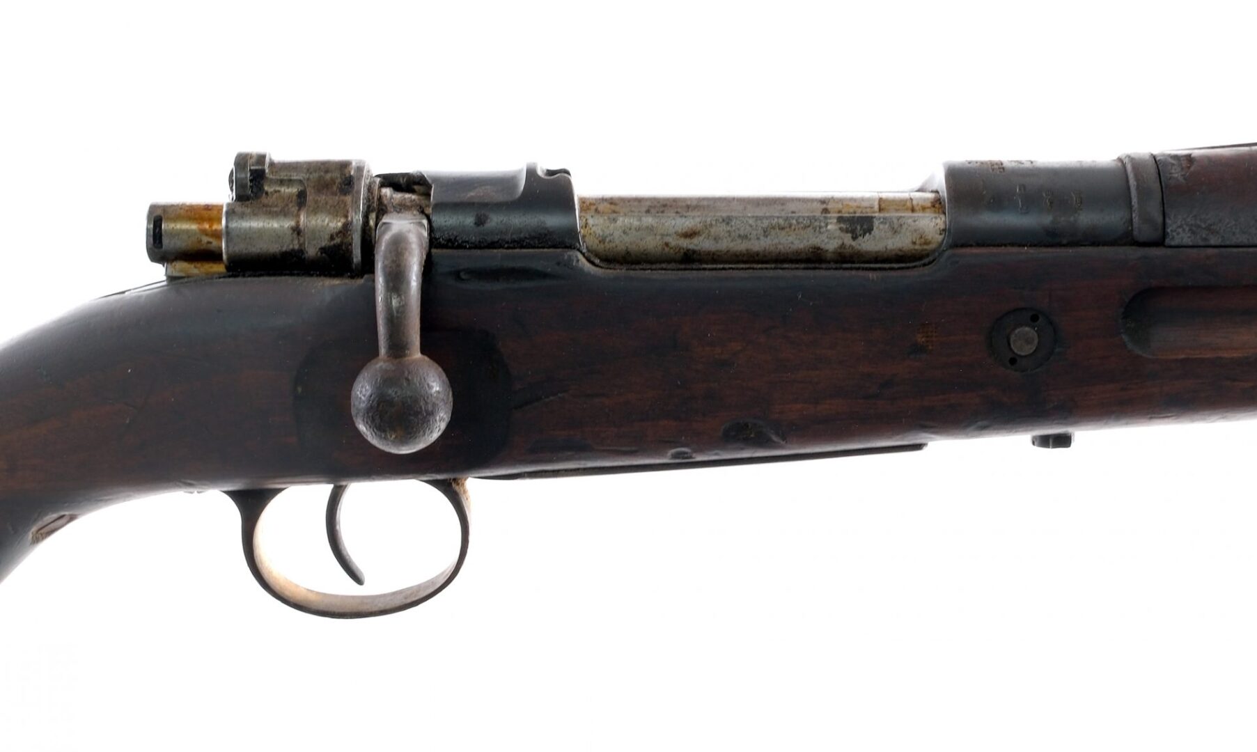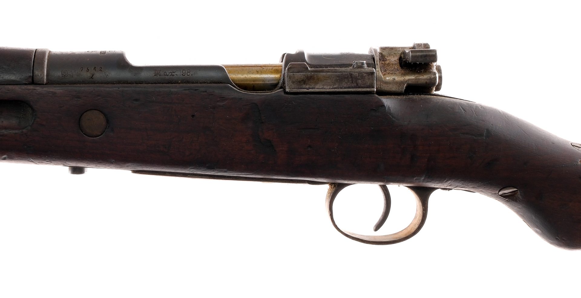 Description Erfurt Kar 98 in 8mm Mauser with a five round capacity and a 24″ barrel. Metal butt plate. Smooth wood stock. Blued trigger guard, trigger, receiver and barrel. Rear bolt safety switch. Rear left side of receiver bolt release. Under barrel fixed bayonet lug and stacking prong. Metal loops for mounting a shoulder sling. Rear adjustable flip up and front fixed blade sight. Non-Matching rifle. Must ship to a C&R or FFL holder. Condition: Fair with scratches, rust and handling wear. The wrist has a large crack and repair with screws. Sold AS-IS. Barrel Length: 24″ Serial: 7562 Manufacturer: Germany Year: 1916 Caliber: 8mm Model: Kar 98 Book# 02936