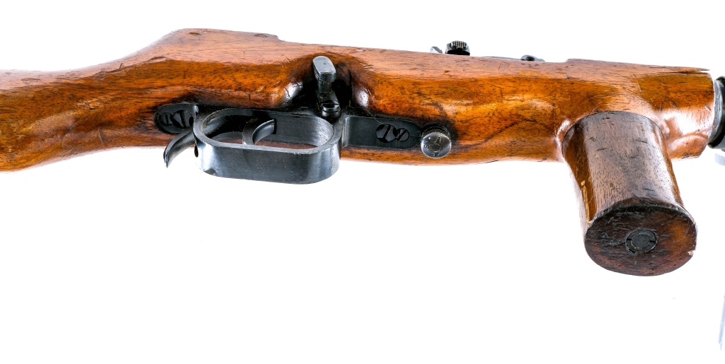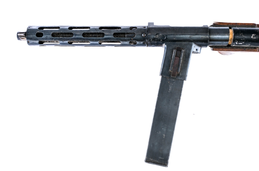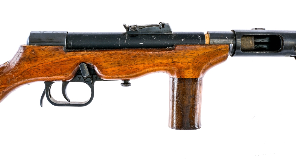 Description Erma EMP chambered in 9mm with one stick magazine and a 13″ barrel. Made inert with a cut and plugged receiver with a wooden dowel. The chamber is plugged/welded and there is a pin through the beginning of the bore in front of the chamber. Most of the bore is clear. Blued and blacked finish. Front barrel shroud. Adjustable rear sight and fixed front blade. The rear of the receiver and the magazine are marked with cross swords. Smooth wood pistol grip stock with vertical grip and metal butt plate. Non gun, ships directly to buyers home. Condition: Good with scratches, scuffs, and handling wear. Spots of metal oxidation and patina. Scratches, scuffs, and dings on the wood. The bore has some spots of rust but has strong visible rifling. SOLD AS-IS. Barrel Length: 13″ Serial: D-9221 Manufacturer: ERMA-WERKE Caliber: 9x19mm Parabellum Model: EMP