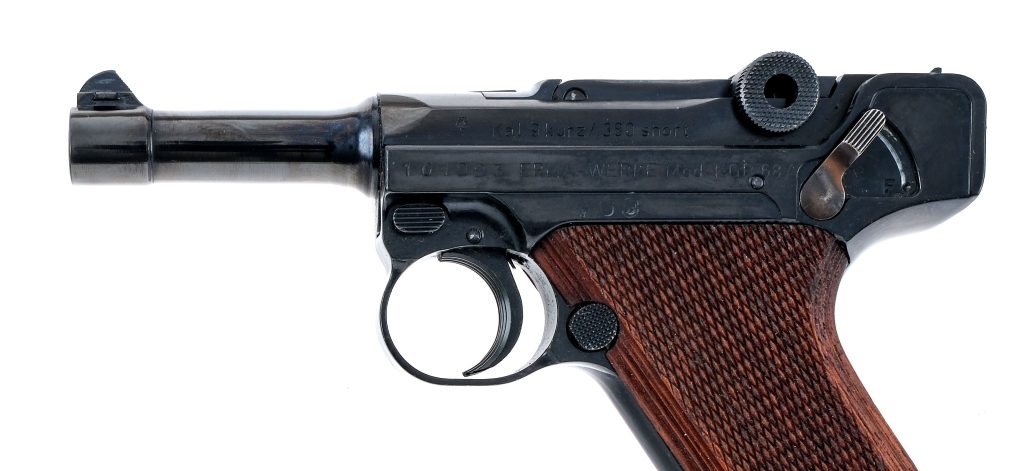 Description Erma-Werke KGP 68A chambered in .380 ACP with one, five round magazine and a 3″ barrel. Manufactured in Germany and imported by LA Distr, marked on the right side. Blued steel frame with checkered wood grips. Push button magazine release. Manual thumb safety. Blued barrel, upper, and toggle with checkered toggle knobs. Rear notch and dorsal fin front blade iron sights. Comes in its factory serial number matching box with manual, polymer grips, and one magazines. Must ship to a FFL or C&R holder. Condition: Fair mainly due to the trigger appearing to be dead, unknown if a new part is required or just needs to be cleaned. Cosmetically very good with light handling and operational wear. Bright and clean rifled bore. SOLD AS-IS, due to the trigger. Barrel Length: 3″ Serial: 101093 Manufacturer: ERMA-WERKE Caliber: .380 ACP Model: KGP 68A Book# 07879