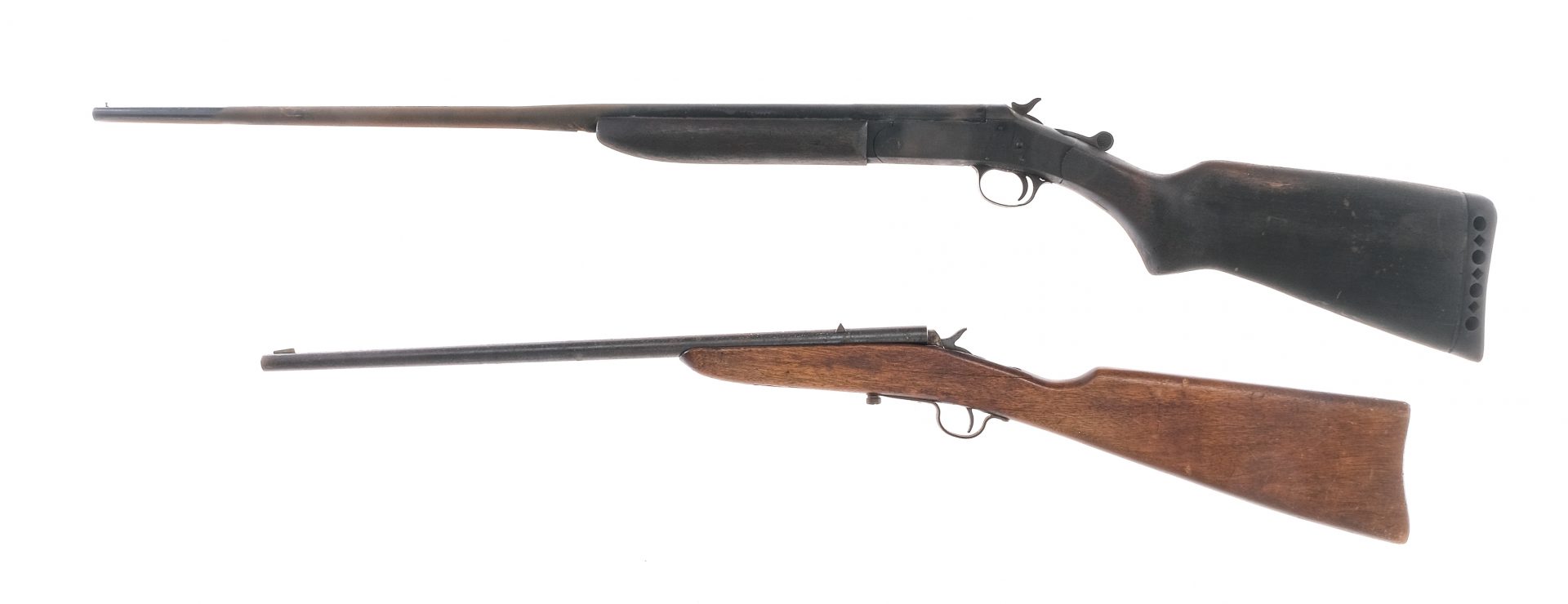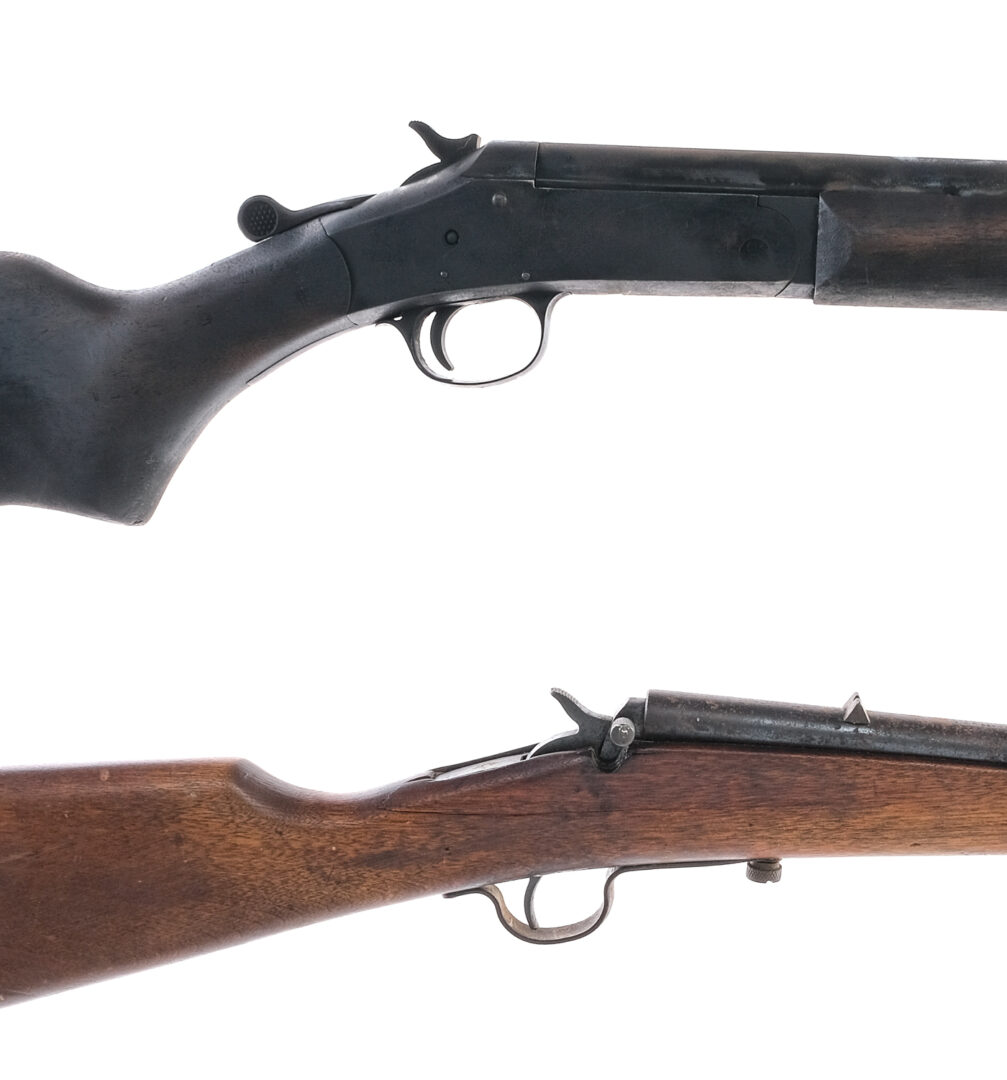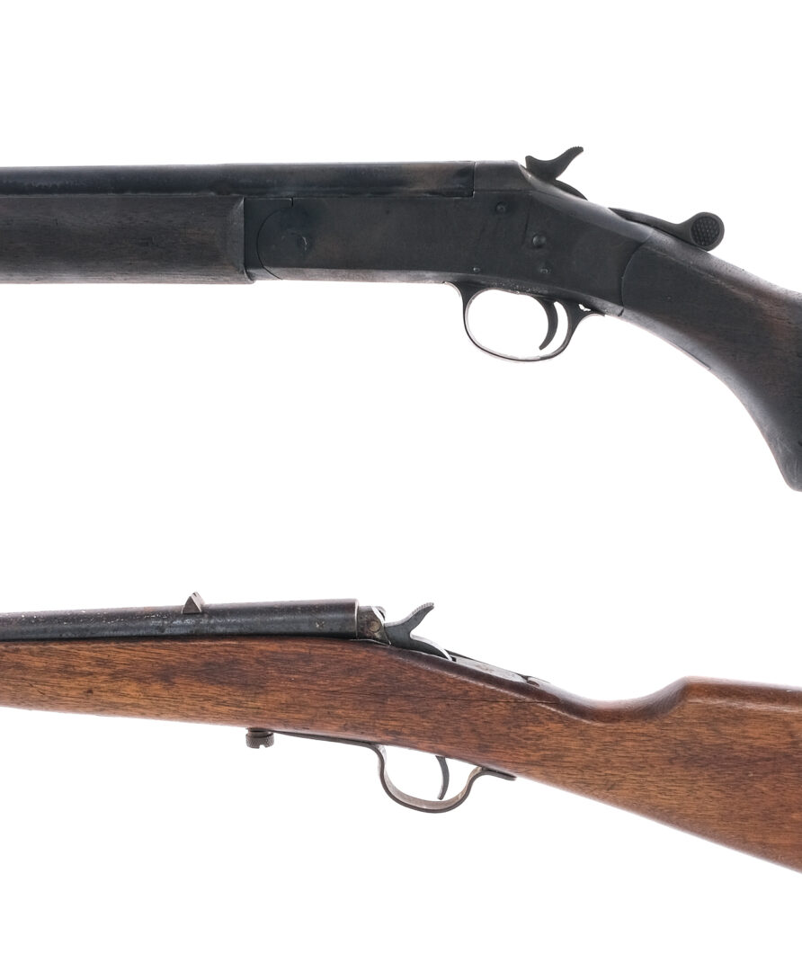 Description This lot is for a Harrington & Richardson Topper Model 48 and a Stevens Junior 11. The H&R is a single shot .410 shotgun with a FULL choke 28″ barrel. Smooth rubber butt plate. Smooth wood stock and forend. Blued receiver, barrel, trigger, and hammer. The Stevens Junior model 11 is a falling block style .22 rifle with a 20″ barrel. Smooth wood stock, no butt plate. Smooth untextured trigger. All metal parts appear to have been blued. Fixed front and rear sights. Both firearms will ship to a C&R or FFL holder. Condition: Poor with heavy oxidation on both long guns. The Topper is covered in a black soot. Both guns’ wood has various cracks and scratches throughout. The smooth bore of the Topper is very clean, and the rifled bore of the Junior is not. Sold AS-IS. Barrel Length: 28″ / 20″ Serial: 5024 / NVSN Manufacturer: H&R, J. STEVENS Gauge: .410 Caliber: .22 Model: Topper 48 / Junior 11 Year-Range Pre-1968 Book# 01042 / 01097