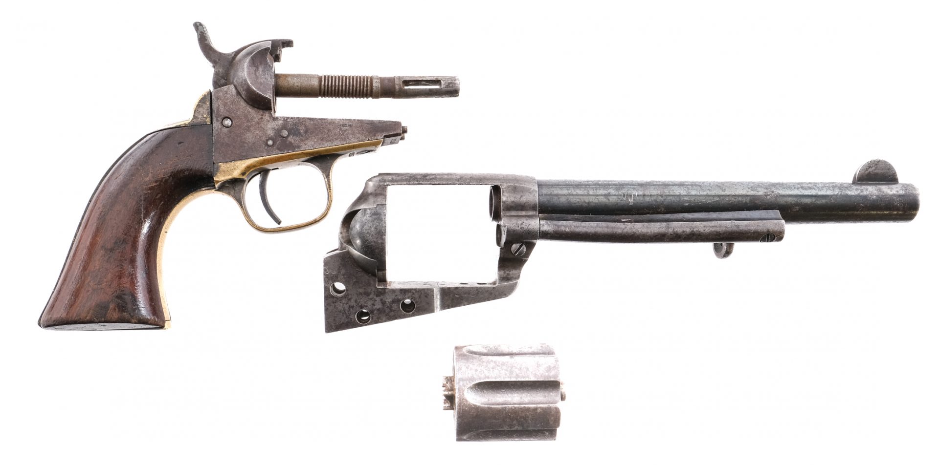 Description This lot is for seven mixed pistols and parts. Includes a frame for a Colt D.A. 38, cylinder, Colt frame, Remington 1861 frame and barrel. Two Cap & Ball Muzzle-Loader Drop Trigger Robert Evens English Dueling Pistols marked 38 on the underside of barrels in an unknown caliber with 3″ barrels. Allen Thurber Cap & Ball Muzzle-Loading pistol in an unknown caliber with a 10″ barrel. Includes one soft zipper case for a pistol. Antique/Parts, No FFL required and ships to buyers home. Condition: Poor with broken/missing parts, rust, pitting and handling wear. Sold AS-IS. Barrel Length: 10″ 3″ 3″ 8″ Serial: 721 38 9919 Manufacturer: Colt Remington Robert Eve Model: 1861 Derringer