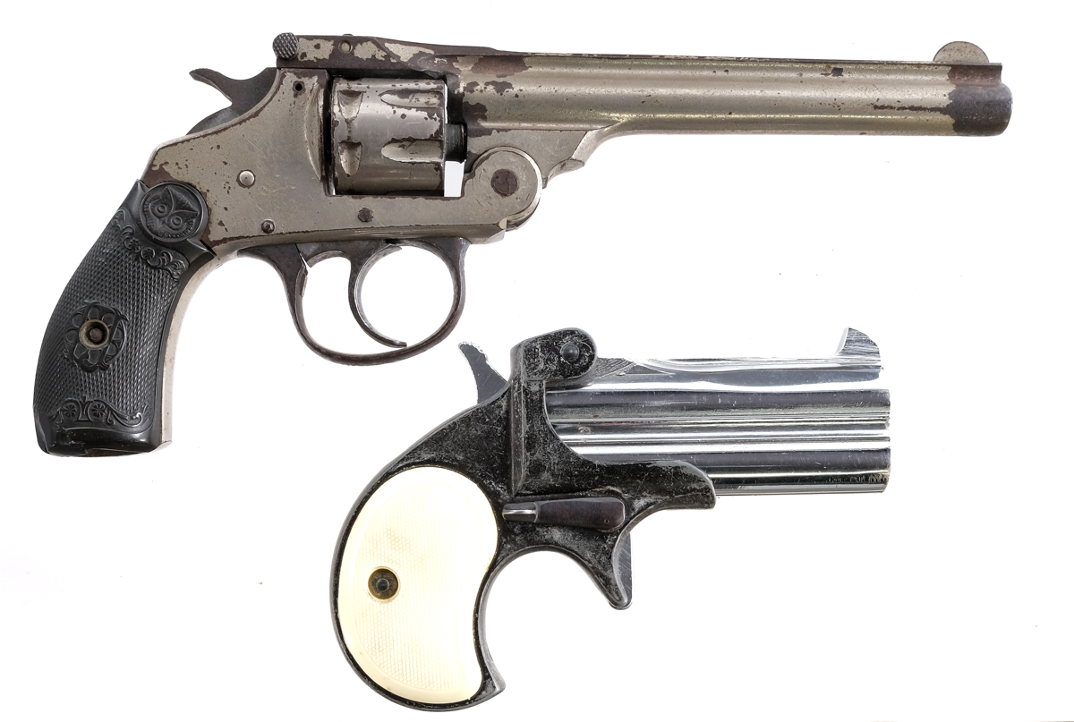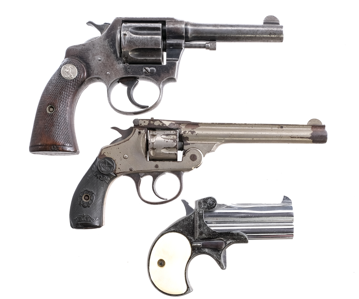 Description This lot is for three Estate found pistols. Colt Police Positive in .38 Smith & Wesson with a six round capacity and a 4″ barrel. Checkered wood grip plates. Blued frame, trigger, checkered hammer, cylinder and barrel. Left side of frame checkered cylinder release. Front fixed blade sight. FIE Derringer in .38 special with a two round capacity and a 3″ over under barrel. Checkered composite grip plates. Nickel plated barrel. Front fixed blade sight. U.S. Revolver Company Top Break in .22 caliber with a seven round capacity and a 5″ barrel. Checkered composite grip plates. Nickel finished frame, cylinder and barrel. Front fixed blade sight. Must ship to a C&R or FFL holder. Condition: Fair with finish wear/loss, broken/missing parts. The Colt has light pitting. The U.S. Revolver Co has a rusty bore. The Derringer has clean bores. Sold AS-IS. Barrel Length: 5″ 4″ 3″ Serial: 502 81243 039606 Manufacturer: FIE Colt U.S. Revolver Co Caliber: .22 .38 .38 Spl Model: Derringer Police Positive Book# 206 207 209