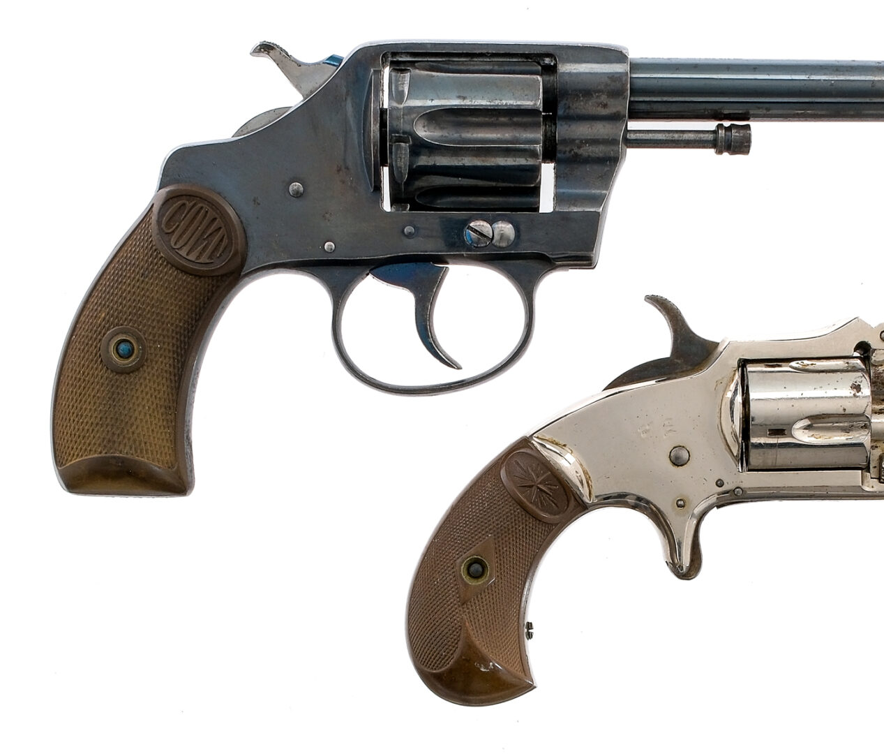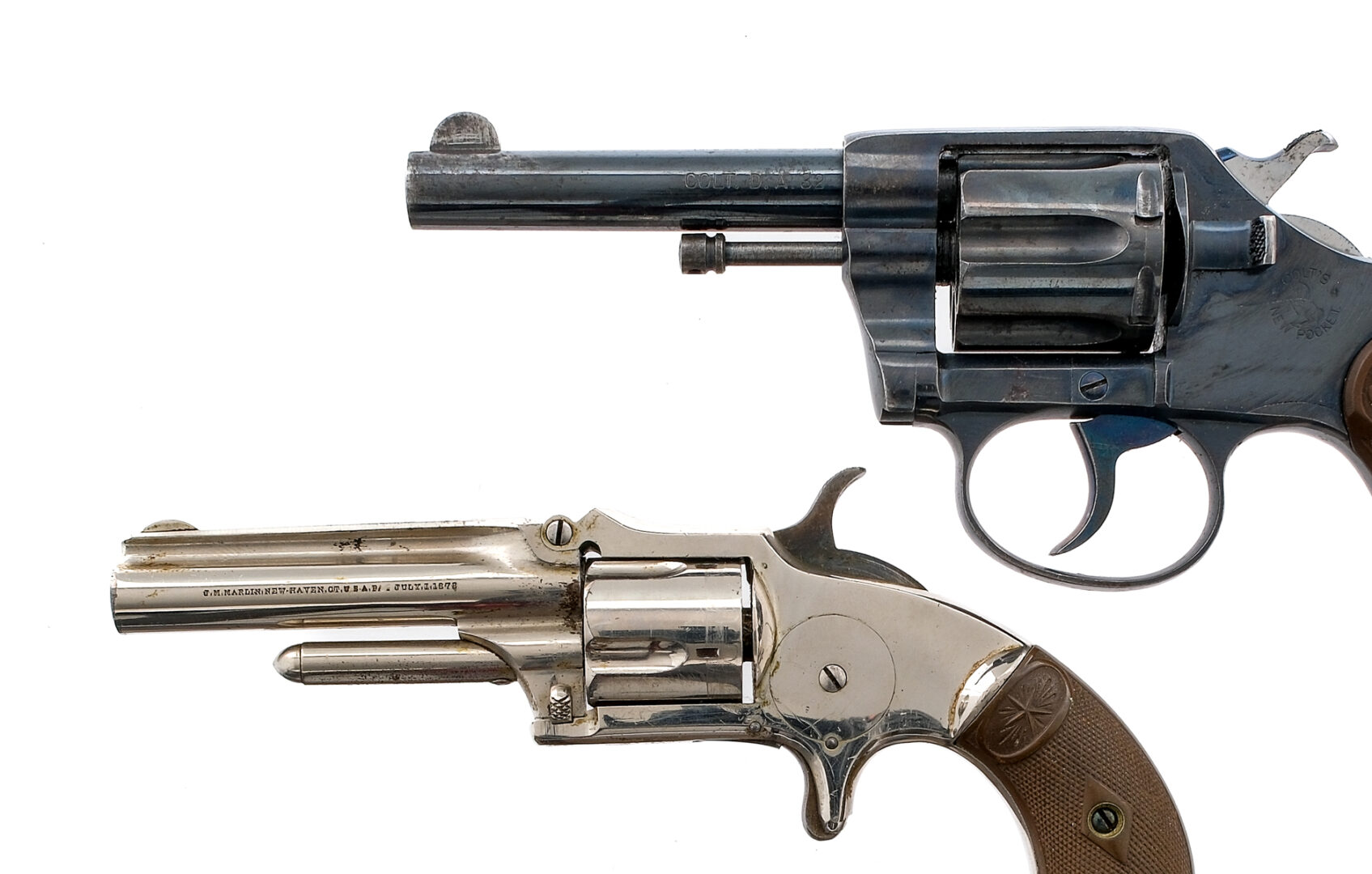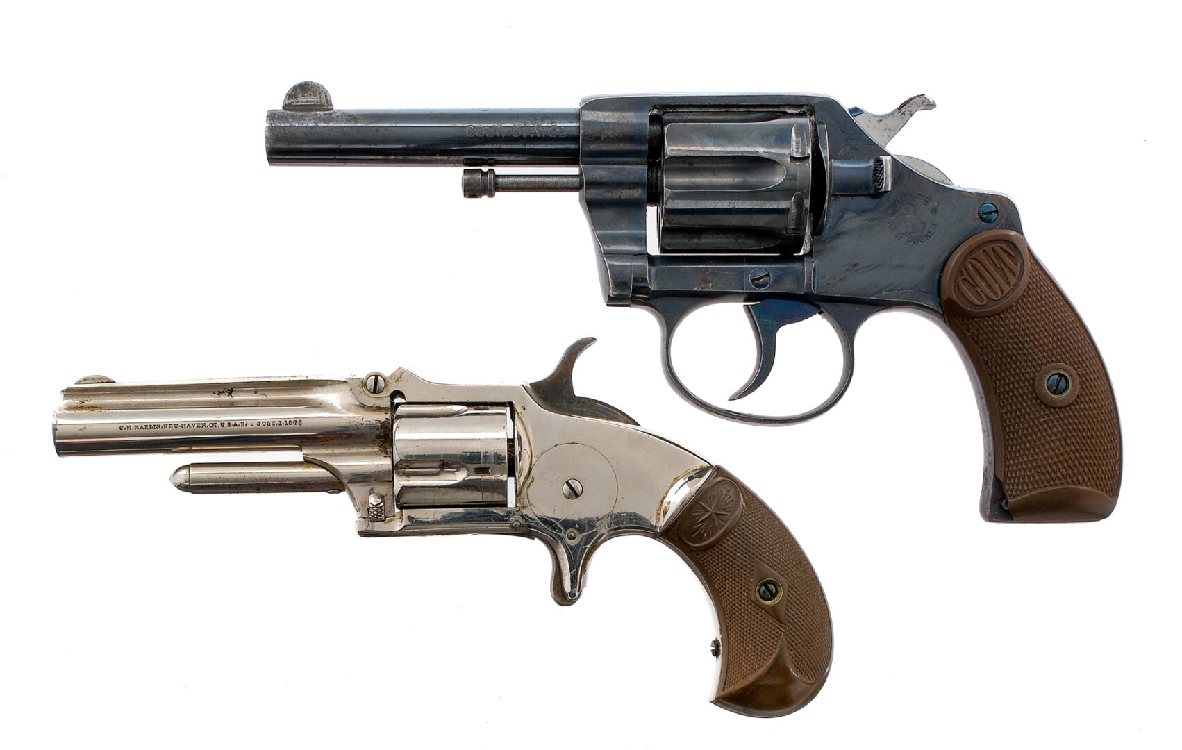 Description This lot is for two Estate found revolvers. Colt New Pocket DA IN .32 Colt with a six round capacity and a 3.5″ barrel. Checkered Colt composite grip plates. Blued frame, trigger, checkered hammer, cylinder and barrel. Left side of frame cylinder release. Front fixed blade sight. Marlin XXX Standard 1878 in .32 Rimfire with a five round capacity and a 3″ barrel. Checkered composite grip plates. Nickel finished frame, cylinder and barrel. Case colored trigger and hammer. Front and rear fixed sights. Must ship the Colt a C&R or FFL holder. The Marlin is Antique, No FFL required and ships to MOST buyers homes. Condition: Fair with scratches, finish wear and spots of rust on the Marlin. The Colt does not cycle and needs Gunsmith. Colt has a clean rifled bore and the Marlin has rust and pitting to the rifled bore. Sold AS-IS. Barrel Length: 3″ 3.5″ Serial: 2071 22535 Manufacturer: Colt Marlin Year: 1904 Caliber: .32 RF .32 Colt Model: XXX Standard 1878 New Pocket DA 32 Book# 02349