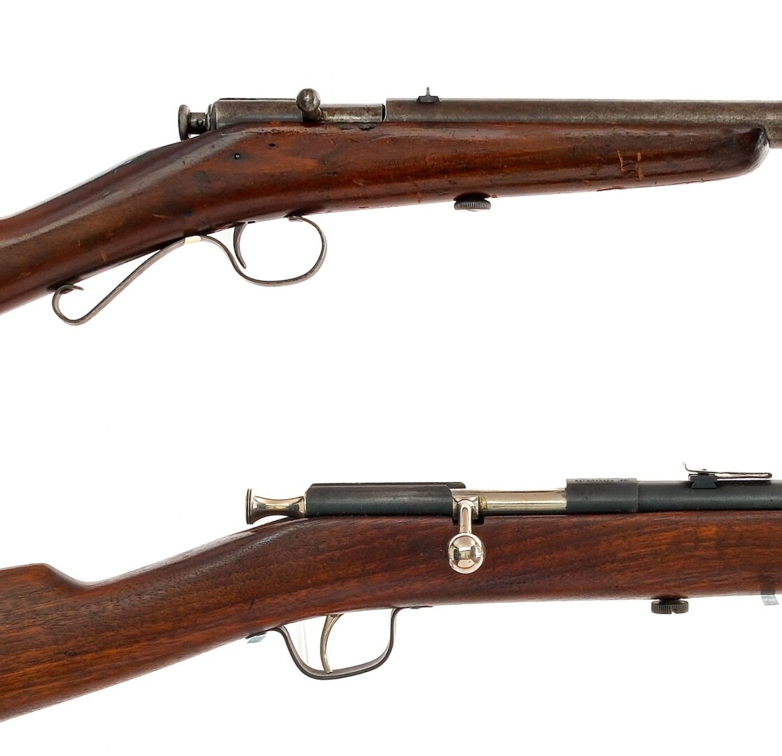 Description Estate rifle lot with two pieces. Winchester Model 1902 in .22 Short, Long or Extra Long with a single round capacity and a 18″ barrel. Smooth wood stock. Finish worn trigger guard, trigger, receiver and barrel. Front and rear fixed sights. Iver Johnson Self Cocking Rifle Model 2X in .22 Short, Long or Long Rifle with a single round capacity and a 24″ barrel. Smooth wood stock. Blued trigger guard, receiver and barrel. Rear adjustable and front fixed blade sight. Mounted with a unbranded leather shoulder sling. Must ship to a C&R or FFL holder. Condition: Good with light scratches and spots of rust. Clean rifled bore on the Iver Johnson and light rust to the rifled bore on the Winchester. Barrel Length: 24″ 18″ Serial: NVSN NVSN Manufacturer: Winchester Iver Johnson Year: 1902 Caliber: .22 S L LR Model: 2X 1902 Year-Range 1930-1955 Book# 03430 03431