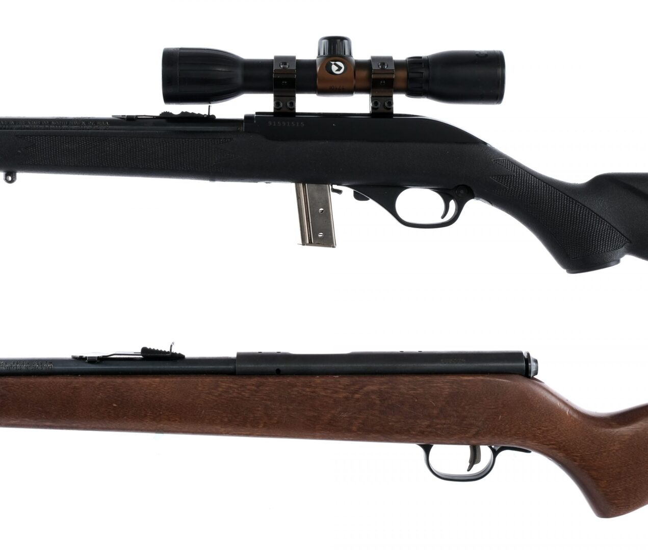 Description Estate rifle lot with two pieces. Savage Mark I in .22 Short, Long or Long Rifle with a single round capacity and a 21″ barrel. Smooth wood stock. Blued trigger, bolt, receiver and barrel. Rear right side of receiver safety switch. Rear adjustable and front fixed blade sight. Metal eyelets for mounting a shoulder sling. Marlin Model 795 in .22 Long Rifle with one, ten round removable magazine and a 18″ barrel. Checkered black composite stock. Blued receiver and barrel. Rear trigger guard push button safety. Receiver mounted with a Gamo .22 Special 4×32 scope with clear glass and a duplex reticle. Metal eyelets for mounting a shoulder sling. Must ship to a FFL holder. Condition: Good with scratches, finish wear/loss, rust and handling wear. Barrel Length: 21″ 18″ Serial: 1335279 91591515 Manufacturer: Marlin Savage Caliber: .22 S L LR Model: MK I 795 Book# 05549 05537