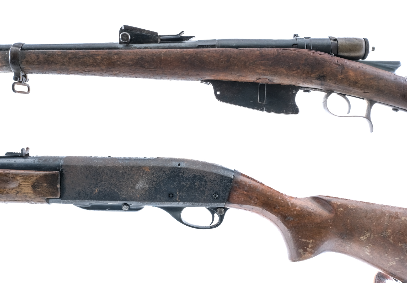 Description This lot is for two Estate found rifles. Remington Model 740 Woodsmaster in .30-06 with one, four round removable magazine. Wood stock and front foregrip. Blued receiver and barrel. Comes mounted with a leather shoulder sling. Rear adjustable and front fixed blade sight. Italian Vetterli in 10.4x47mm with a four round capacity and a 33.5″ barrel. Smooth wood stock and front forend. Rear flip up adjustable and front fixed blade sight. Under barrel cleaning rod. Remington Model 740 Woodsmaster in .30-06 with one, four round removable magazine and a 22″ barrel. Smooth wood stock and front foregrip. Rear adjustable and front fixed blade sight. Comes with a leather shoulder sling. The Vetterli is Antique and ships to buyers home. The Remington needs a FFL to ship to. Condition: Poor with finish wear/loss, scratches, wood dings and rust. The rifled bores have rust. The Remington has a bulge in the barrel. Sold AS-IS. Barrel Length: 22″ 33.5″ Serial: 323357 7209 Manufacturer: Terni Italy Remington Year: 1886 Caliber: .30-06 10.4x47mm Model: Vetterli 740 Woodsmaster Book# 10-668-669