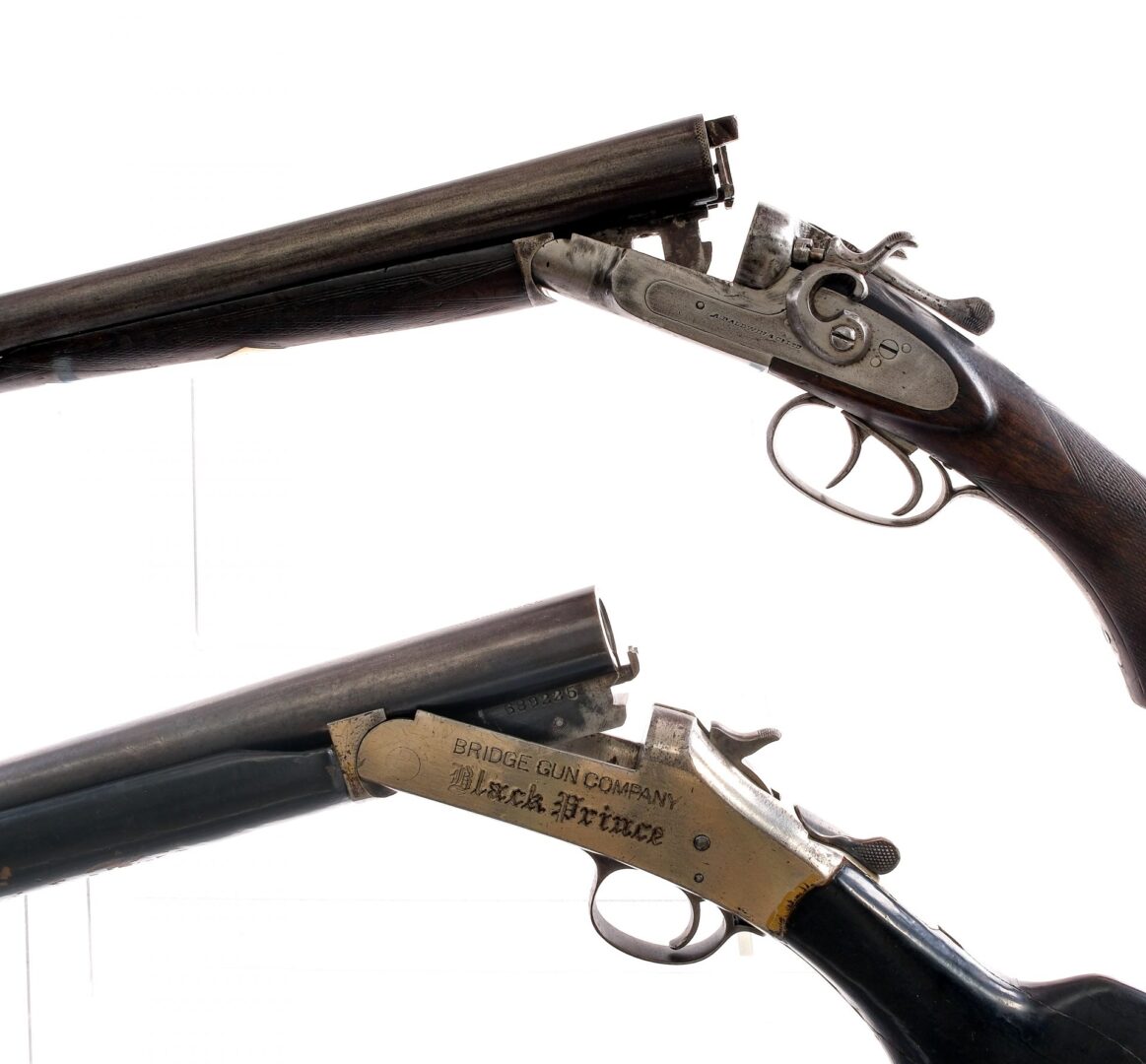 Description Estate shotgun lot with two pieces. A. Baldwin in 12 gauge with a two round capacity and a 29.25″ barrel. Checkered wood stock and front forend. Finish worn double triggers, double hammers, receiver and barrel. Front fixed metal bead sight. Bridge Gun Co Black Prince in 20 gauge with a single round capacity and a 25.5″ barrel. Black finished wood stock and front forend. Nickel finished receiver, trigger guard and top lever. Finish worn trigger, hammer and barrel. Must ship to a C&R or FFL holder. Condition: Fair with scratches, finish wear/loss, broken/repaired wood, refinished parts and rust. The smooth bores have rust/pitting. Sold AS-IS. Barrel Length: 29.25″ 25.5″ Serial: 670 A689225 Manufacturer: A Baldwin Bridge Gun Co Gauge: 20 12 Model: Black Prince SxS Shotgun Book# 03269 03138