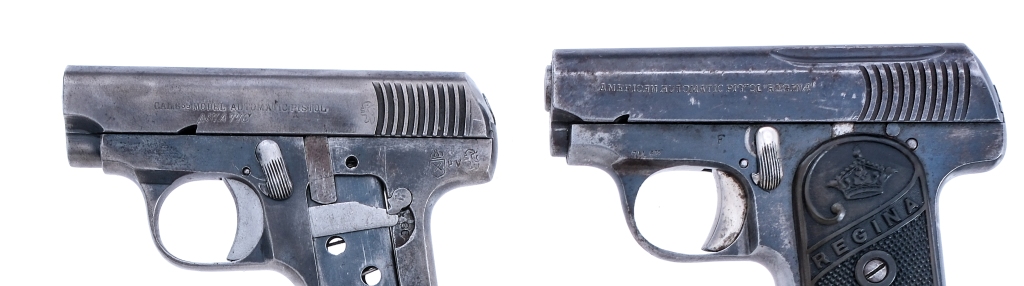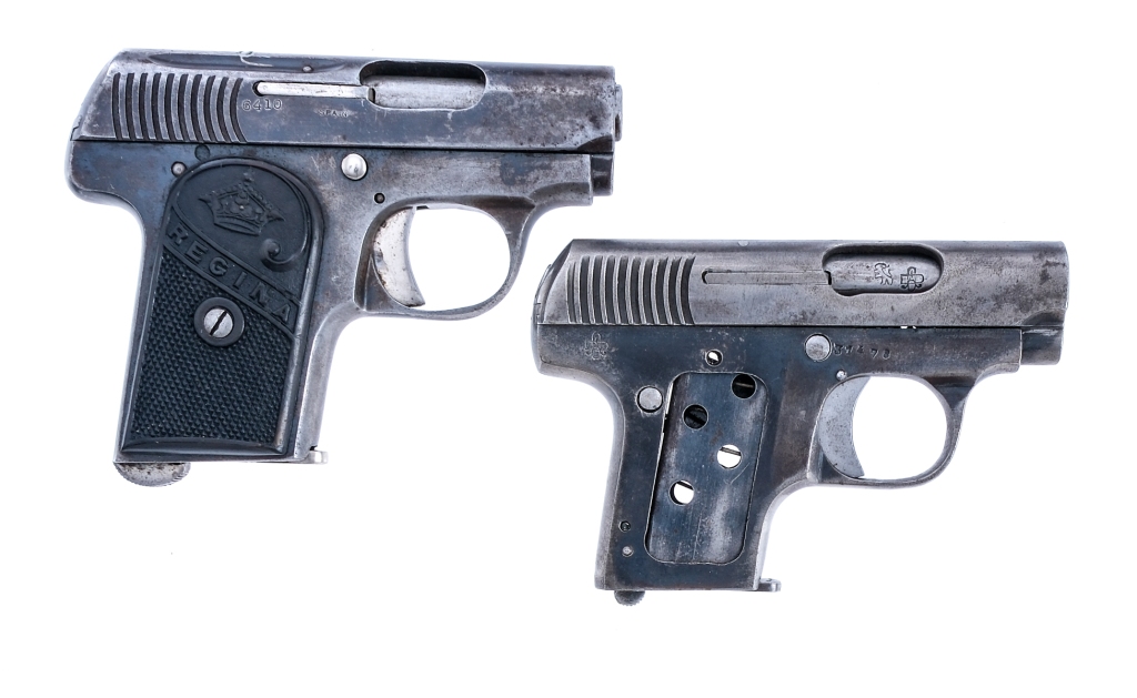 Description Estate lot with two Spanish made .25 ACP pistols. American Automatic Pistol “Regina” in 6.35mm which is .25 ACP with one, six round removable magazine and a 2″ barrel. Checkered composite grip plates. Blued frame and serrated slide. Left side of frame safety switch. Model Automatic Pistol “Asiatic” in 6.35mm which is .25 ACP with one six round removable magazine and a 2″ barrel. Missing the grip plates. Blued frame and serrated slide. Left side of frame safety switch. Must ship to a C&R or FFL holder. Condition: Fair with one pistol missing the grip plates, scratches, finish wear/loss and rust. Both pistols have spots of rust and pitting to the rifled bores. SOLD AS-IS. Barrel Length: 2″ 2″ Serial: 31478 6410 Manufacturer: Spain Caliber: .25 ACP Model: Regina Asiatic Book# 05671 05653