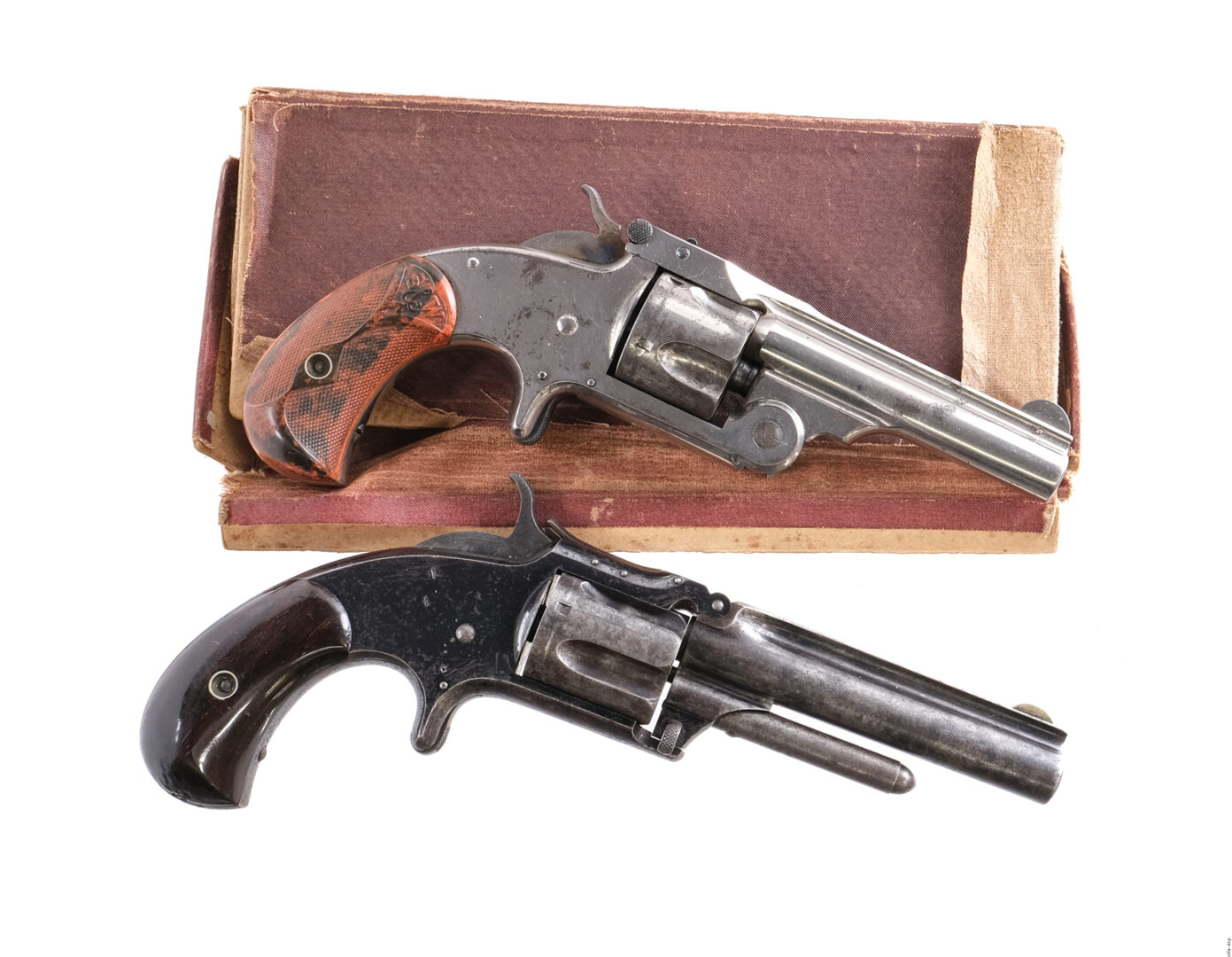 Description Estate found Smith & Wesson Revolver lot with two pieces. S&W Model 1 1/2 New Model Second Issue in .32 S&W with a five round capacity and a 3.5″ round top rib barrel. Rosewood grip plates. Blued frame, checkered trigger, hammer, cylinder and barrel. Front fixed blade sight. S&W Model 1 1/2 in .32 S&W with a five round capacity and a 3″ barrel. Checkered S&W Red Mottled grip plates with matching serial number on the back of one. Nickel finished frame, cylinder and barrel. Case colored checkered trigger and hammer. Top barrel located checkered action Tip Up lever. Comes with One Vintage S&W hinged box. Antique, No FFL required and ships to buyers home. Condition: Very Good with finish wear, scratches and touches of rust. The rifled bores both have rust and very light pitting with visible rifling. Barrel Length: 3.5″ 3″ Serial: 35704 32072 Manufacturer: Smith & Wesson Caliber: .32 S&W Model: 1.5 2nd Issue 1.5