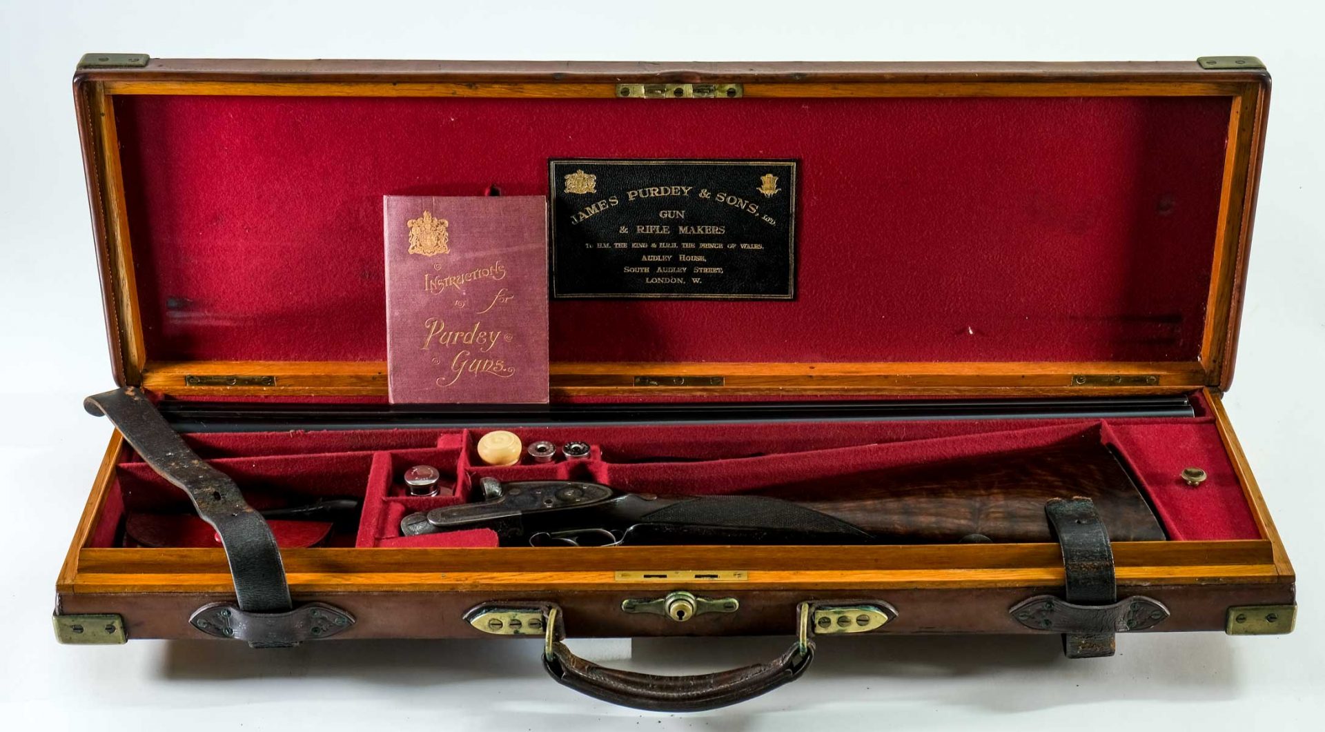 UPDATE: There is a period modification to the chambers. They were opened up from 2.5″ to accept larger shells. This world class sidelock shotgun was hand crafted in October 1928 masterfully engraved by J. Purdey & Sons Gun & Rifle Makers. The concave solid rib is marked “J. PURDEY & SONS (in gold inlay) AUDLEY HOUSE, SOUTH AUDREY STREET LONDON. MADE OF SIR JOSEPH WHITWORTH”S FLUID PRESSED STEEL”. The case hardened action features floral scroll engraving and circular bouquets covering the entire action from fence to trigger guard with high polished blue highlights. Both locks and the bottom of the receiver are marked “J. Purdey & Sons”. The break lever, trigger guard and forearm hardware are engraved with the same patterns. The barrel flats are marked with many proofs and the water table is marked with two “crown / V” proofs. The barrels are chambered in the rare 2 1/2″, choked cylinder/modified with ejectors. Double trigger, tang mounted safety with gold inlaid “SAFE” and mounted with extra fancy, checkered splinter forearm and straight grip stock and checkered bare butt. Complete in a hard leather take down trunk with brass corner protectors, brass hardware, leather handle and red colored velvet lining with J. Purdey & Sons label affixed to the inside of the lid. Also included is the original instruction manual (very interesting read) a one piece rosewood cleaning rod and handle, assortment of wood handled tools, leather pouch with bore brush and mop, cleaning heads, nickel snap caps marked A&F NY and a nickel oiler marked J. Purdey & Sons. Accompanied by a letter of authenticity from Purdey Confirming the above. The following is the letter (condensed for space) received with this gun attesting to its original owner and his story: This 20-gauge double was one of a pair acquired by my great-grandfather Henry Wheeler de Forest from James Purdey & Sons in London. He was a crack shot and an avid and accomplished sportsman with a passion for bird hunting and salmon fishing. During the first decades of the 20th Century, the family removed to Penshurst Castle in Kent, England each autumn for the shooting. The other gun in the pair was given to his host in gratitude for their hospitality. A descendant of French Huguenots, Henry de Forest lived from 1855 to 193 8, was a graduate of Williston Seminary at Yale University in 1876 and was a graduate of Columbia University Law School in 1878. Initially trained as an attorney, he practiced law with the firm of de Forest & Weeks and its successor firm, de Forest Brothers, until 1932. A prominent railroad executive and industrialist of the Gilded Age, Henry de Forest was the chairman of the Executive Committee of the Southern Pacific Railroad from 1925 to 1928, served as the chairman of its Board of Directors from 1929 to 1932 and served as a director from 1905 until his death. In addition, he served as a director and member of the Executive Committee of each of the Texas & New Orleans Railroad and the Delaware & Hudson Railroad, and as a director of each of the Arizona Eastern R.R. Co., Galveston, Harrisburg & San Antonio Railway Co., Houston & Shreveport R.R. Co., Houston & Texas Central R.R. Co., Houston East & West Texas R.R. Co., Illinois Central R.R. Co., Louisiana & Western R.R. Co., Morgan’s Louisiana & Texas R.R. & Steamship Co., New Jersey & New York R.R. Co., and Yazoo & Mississippi Valley R.R. Co. Having interests that extended beyond the railroad industry, he was a trustee (with Elihu Root) of the majority of the capital stock of the Equitable Life Assurance Society and was involved in the mutualization of The Equitable and Metropolitan Life, a trustee and chairman of the Executive Committee of the Bank for Savings in New York, chairman of the Pacific Oil Company during its merger with Standard Oil of California (now Chevron), ….. Henry de Forest was particularly interested in wildlife conservation serving as the Director of the National Parks Association from 1924 through 1935 and being instrumental in the founding of the Sage and Rockefeller Bird Sanctuaries on the Gulf Coast of Louisiana and the Guardianship Association of the Restigouche River, an association formed to protect salmon rivers in Canada. Nethermuir, his estate in Laurel Hollow on the north shore of Long Island, New York, was designed by Frederick Law Olmstead and is now the site of the Cold Spring Harbor Laboratories, known for its pioneering work on the human genome. Edie Sedgwick, his granddaughter, was Andy Warhol’s muse in the 1960s and the subject of the film “Factory Girl”. SIGNED, John Beverly Duer Condition: NRA Antique Fine. Over 80% bluing remains on barrels with only minor scratches and very fine pitting where the fore end meets the barrels. Case coloring is greater than 65%, brilliant and prominent with only general edge wear. Wood is crack free, exhibits plenty of dings and nicks from use but nothing that distracts the eye. Checkering is evenly worn. Mechanically excellent. Case is worn but not abused, very good for age.
