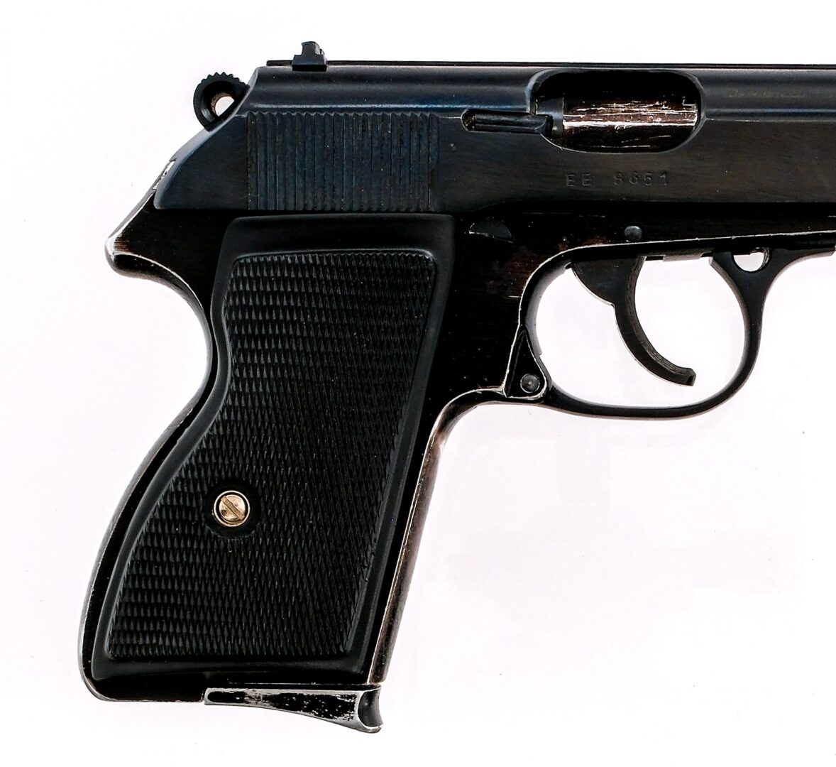 Description FEG model AP 7,65 semi auto pistol chambered in .32 ACP (7.65mm) with one eight round removable magazine and a 3.75″ barrel. Features titanium alloy frame with black checkered grips, serrated trigger, serrated hammer, safety/decocker, and knurled magazine release. Slide features rear serrations, fixed iron sights, and grooved top rib. Matching frame and slide, magazine is not matching. This is a Hungarian copy of the Walther PP with slight modifications most notably the addition of a internal trigger safety. Must ship to an FFL. Condition: Good, Very Good, with operational and handling wear. Black finish on frame is worn around high edges with most around grip. Slide has very little wear. Bore is bright with strong rifling. Barrel Length: 3.75″ Serial: EE8651 Manufacturer: FEG Caliber: .32 ACP Model: AP 7,65 Year-Range 1970-2003 Book# 03308
