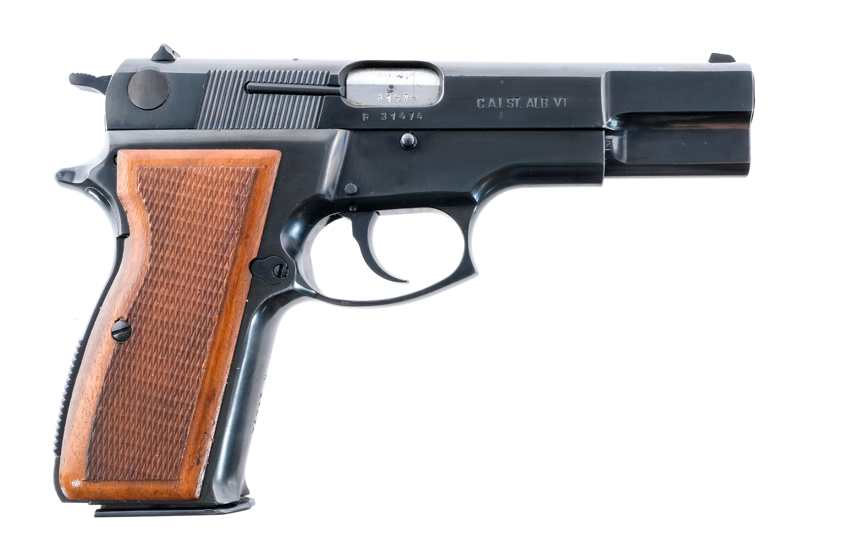 Description FEG Hungry P9R in 9mm with one, fourteen round removable magazine and a 4.5″ barrel. Checkered wood grip plates. Blued frame, untextured trigger, serrated hammer and serrated slide. Left side of frame serrated slide release and checkered magazine release button. Left side of slide serrated safety switch. Front and rear fixed sights. Must ship to a FFL holder. Condition: Very good/Excellent with light scuffs and handling wear. Clean rifled bore. Barrel Length: 4.5″ Serial: R31474 Manufacturer: FEG Caliber: 9mm Model: P9R Year-Range 1980-2000 Book# 8-812