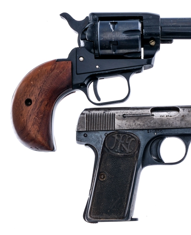 Description This lot is for two handguns. FIE Little Ranger in .22 Long Rifle with a Six round capacity and a 3.75″ barrel. Smooth wood grip plates. Black finished frame. Blued cylinder and barrel. Left rear frame located safety. Front fixed blade sight. FN Model 1910 in .380 ACP with one, six round removable magazine and a 3.5″ barrel. Checkered pressed horn grip plates. Blued frame, trigger and serrated slide. Left side of frame knurled safety. Trench sights. Must ship the FIE to a FFL holder and the FN has to ship to a C&R or FFL holder. Condition: Good with scratches, finish wear/loss and rust on the FN with the FN grip plate being damaged. The FIE has a clean rifled bore and the FN has light rust to the rifled bore. Barrel Length: 3.75″ 3.5″ Serial: 285230 TX67922 Manufacturer: FIE FN Caliber: .22 LR .380 ACP Model: Little Ranger 1910 Book# 08250 08248