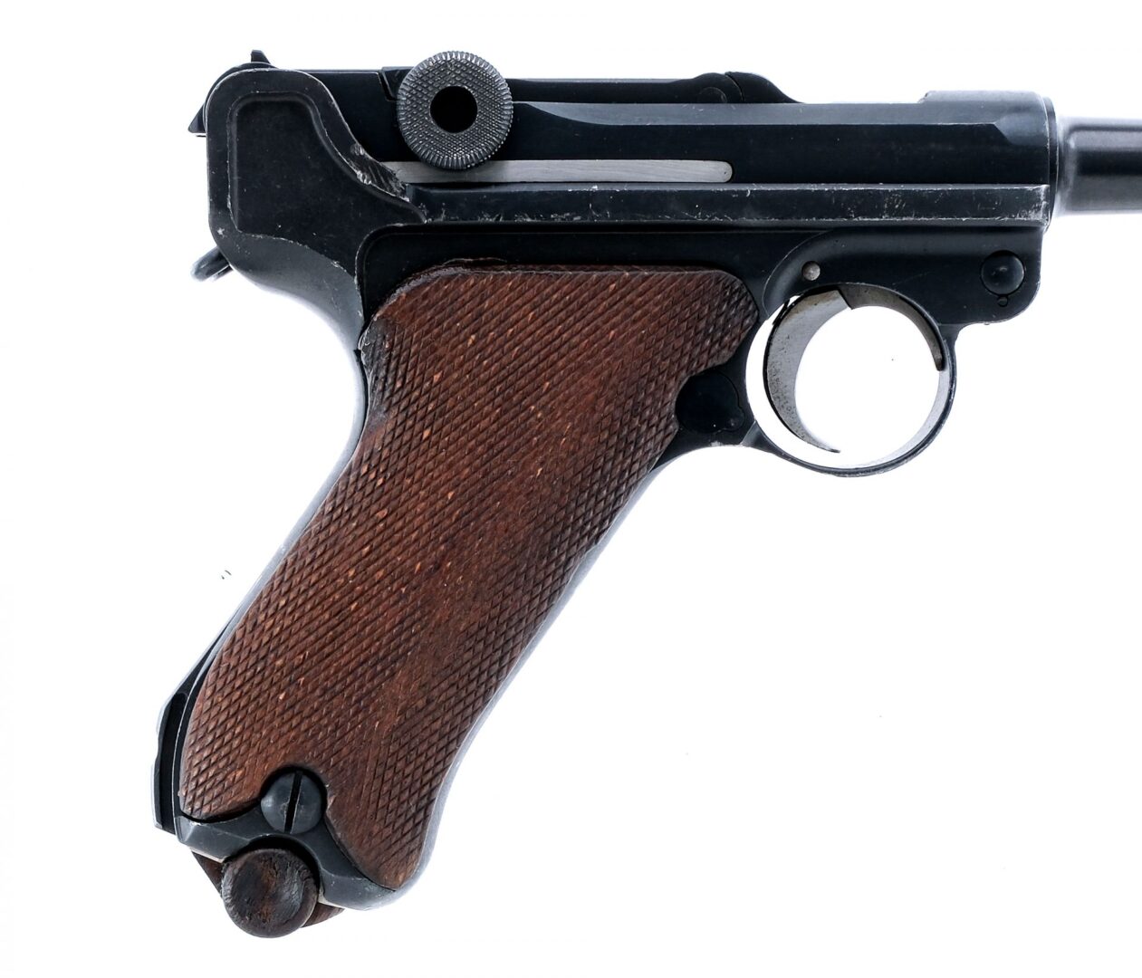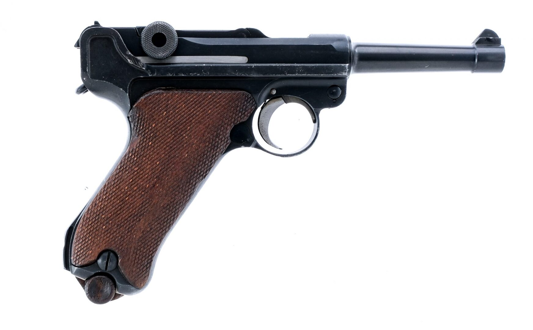 Description DWM 1923 Finnish Military Contract P08 Luger chambered in .30 Luger with two, eight round magazines and a 3 7/8″ (90mm) barrel. This is a Finnish military contract Luger that was manufactured after The Treaty of Versailles. During that time Germany was restricted on the barrel length and chambering of their arms. Which is why this Luger is chambered in .30 Luger with a shorter barrel. Blued frame with stock lug and checkered wood grips. Unfinished wide trigger with narrow trigger guard. Blued safety lever with “GESICHERT.” marking. Blued barrel and receiver. Blued toggle with flat checkered toggle knobs. Dorsal fin front blade and V-notch rear sight. The left side of the receiver is marked with Crown over N nitro proof and [SA] Finnish Army Acceptance Mark. N nitro proof marked on the breech block. DWM inscription marked on the top of the toggle. Many of the parts are mismatched or un-serialized, likely replaced overtime by the Finnish. Both of the magazines have tin bodies with wood bases. One is un-serialized and the other is serialized 3308″ Comes with a [SA] stamped leather holster. The rear of the holster is marked “BERLIN” Waa286 1938. Must ship to a FFL holder. Condition: Good/Very good with some scratches, high edge wear, and general handling wear. Spots of metal oxidation, finish patina, and finish thinning. Some scratches and edge wear on the grips. Bright and clean bore with strong rifling. Barrel Length: 3 7/8″ Serial: 9332t Manufacturer: DWM Caliber: .30 Luger Model: P08 Luger Book# 04285