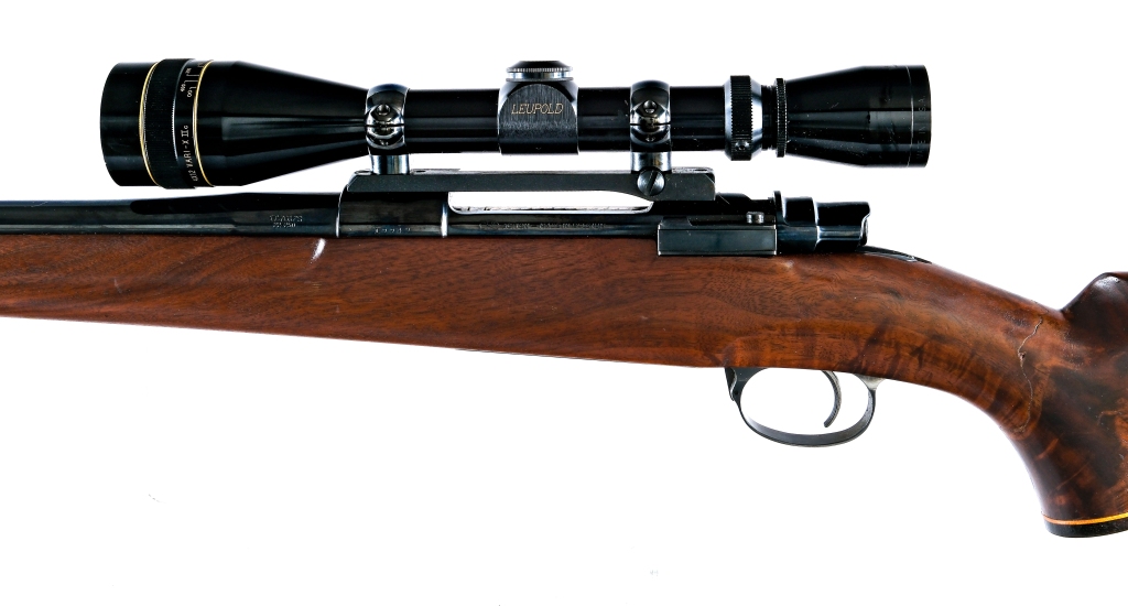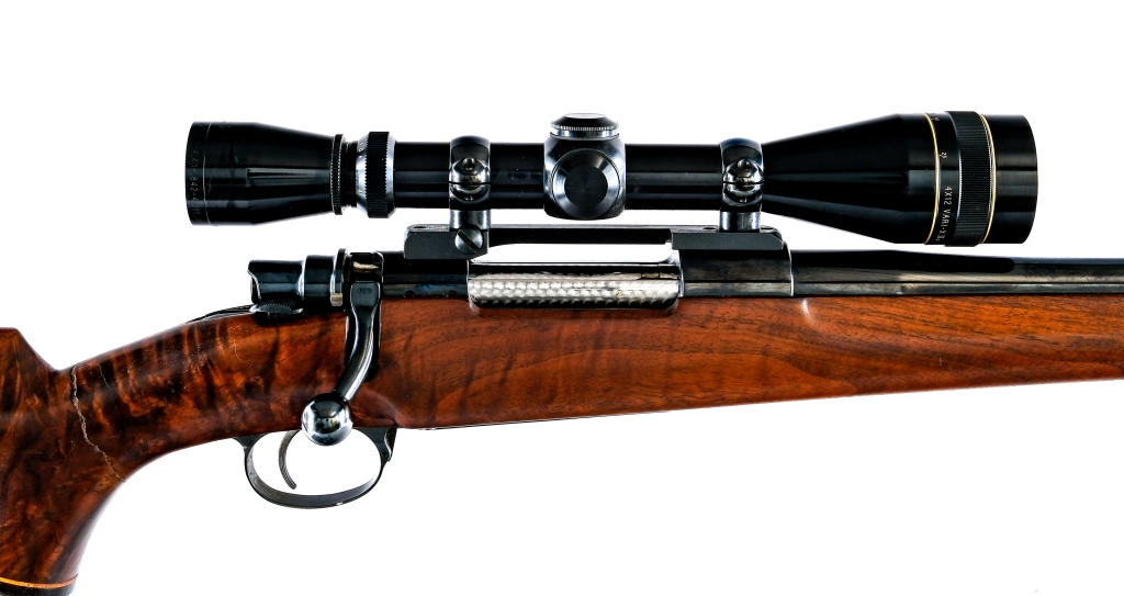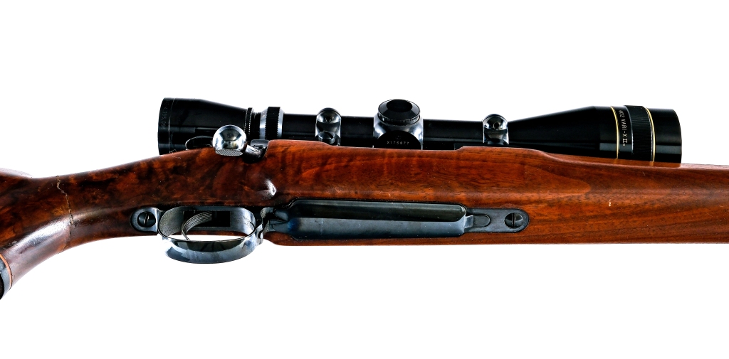 Description Flaigs/FN Sporting Mauser in .22-250 with a five round capacity and a 26.5″ barrel. Rubber butt pad. Smooth premium figured Monte Carlo style wood stock and front forend. Blued trigger guard, serrated trigger, receiver and barrel. Jeweled bolt body. Rear right side of receiver safety. Rear left side of receiver bolt release. Fixed sights have been removed. Top of receiver is mounted with a Leupold Vari-X II 4×12 scope with clear glass and a duplex reticle. Must ship to a C&R or FFL holder. Condition: Poor with a large break and repair around the entire wrist of the wood stock. Clean rifled bore. SOLD AS-IS. Barrel Length: 26.5″ Serial: 19949 Manufacturer: Flaigs FN Caliber: 22-250 Model: Sporting Mauser Year-Range 1950-1974 Book# 07785