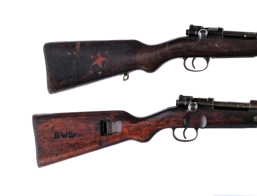 Description This lot is for two Mauser pattern rifles with 24″ barrels. First is a FN 24 chambered in 7mm Mauser with a five round capacity. Import marked on the barrel. Marked 1932 on the top of the receiver. Red star is marked on the right side of the stock. The second rifle is a Danzig Kar 98 in 8mm with a five round capacity. Manufactured in 1910. The right side of the stock is marked “EWE”. Both rifles have blued finished with wood stocks. Adjustable rear sights and fixed front blades. Front bayonet lugs. Must ship to a FFL or C&R holder. Condition: Fair with both showing heavy finish patina and spots of metal oxidation. Scratches, scuffs, dings, and small cracks on the wood. The Danzig is missing its magazine spring and follower. Both bores are decently bright given their ages, but shows spots and frosting of metal oxidation. Both have strong visible rifling. SOLD AS-IS for parts and restoration. Barrel Length: 24″ Serial: 20208, 219C Manufacturer: FN, Danzig Caliber: 7mm, 8mm Model: 24, Kar 98 Book# 06036 05728