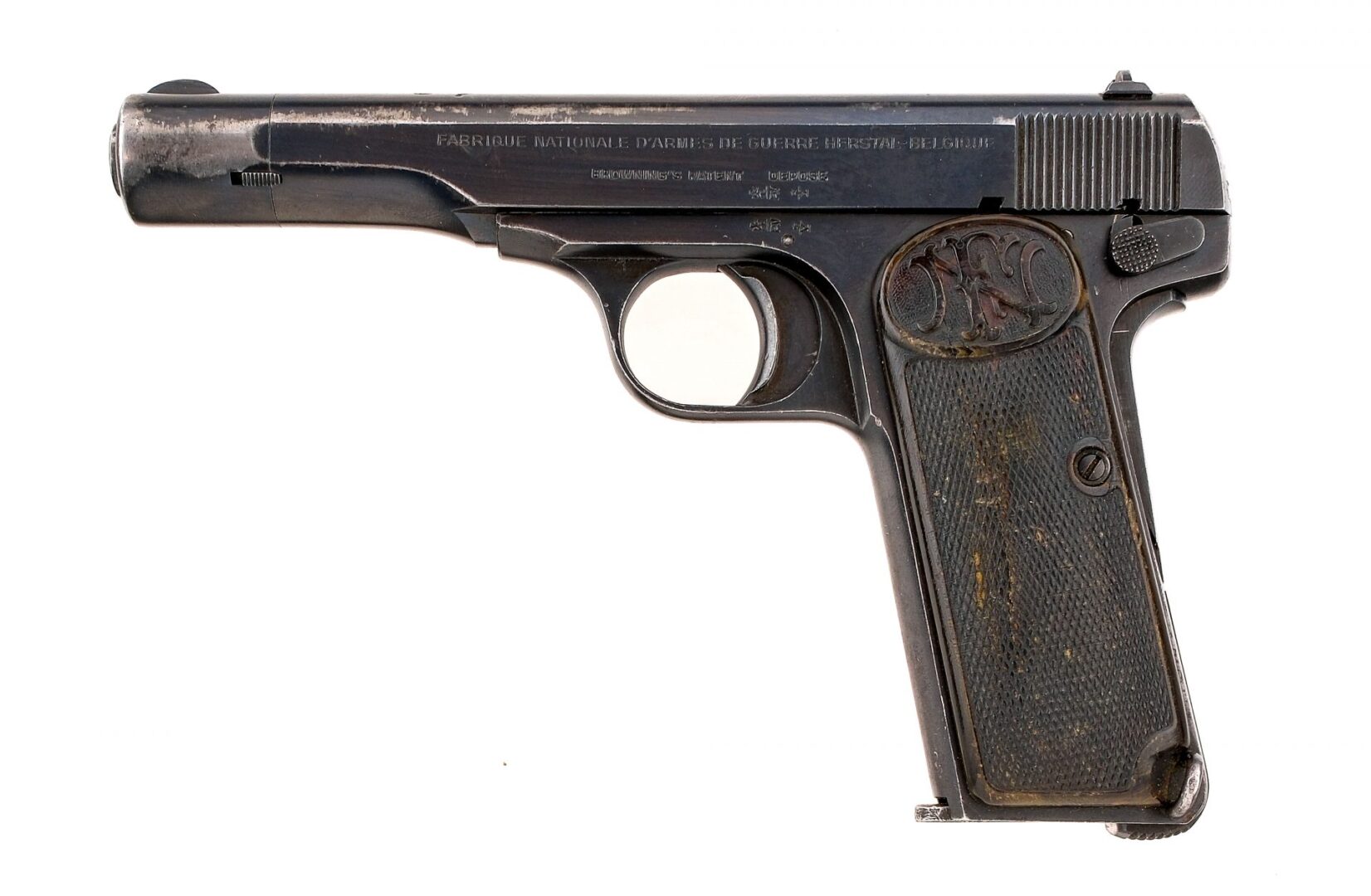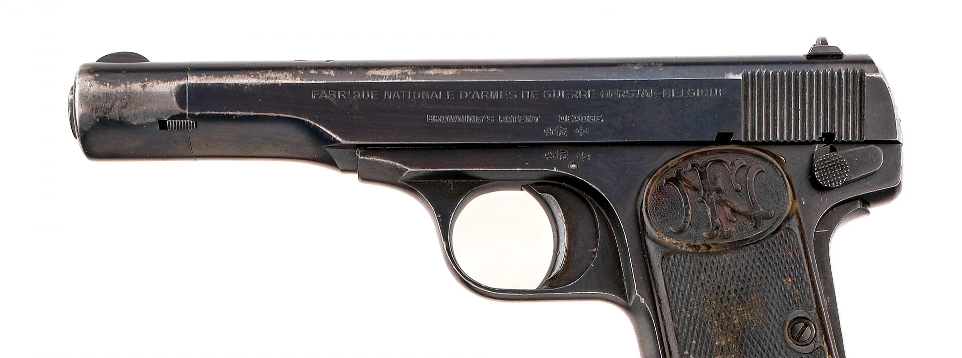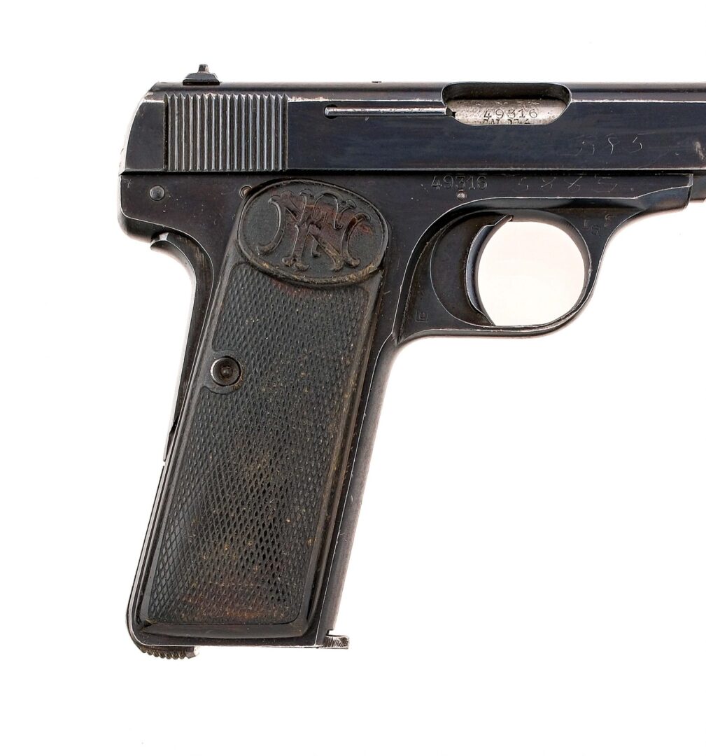 Description Belgian Fabrique National Herstal FNH model 1922 chambered in 7.65 (.32 ACP) with one, nine round removable magazine and a 4.5″ barrel. Blued steel frame with checkered wood FN grips and lanyard loop. Blow back pistol with single action striker-fired trigger. Serrated heel magazine release. Frame mounted manual thumb safety and grip depression safety. Blued serrated slide with fixed iron sights. The top of the slide is marked with Queen Wilhelmina Crown over W proof. Serial number matching frame, barrel, slide, and barrel extension. Must ship to a FFL or C&R holder. Condition: Good/Very good with scratches, scuffs, and general finish wear from handling. Some light spots of surface metal oxidation. Spots of finish loss mostly towards the muzzle. Scratches and scuffs on the grips. Bright and clean rifled bore. Barrel Length: 4.5″ Serial: 49316 Manufacturer: FABRIQUE NATIONALE Caliber: .32 ACP Model: 1922 Book# 04255