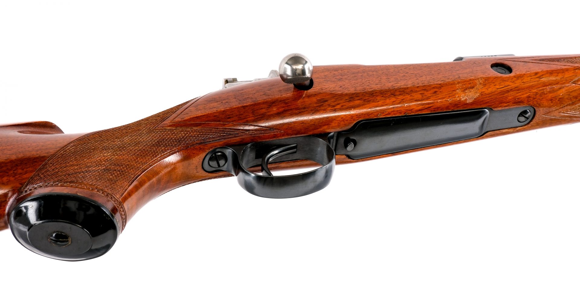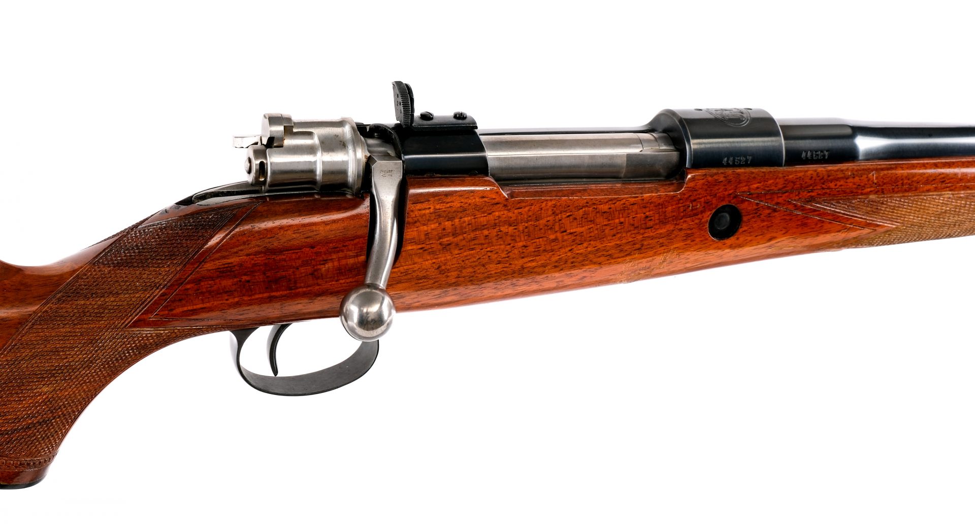 Description FN Herstal Deluxe Mauser in .30-06 with a five round capacity and a 24″ Chrome Vanadium Steel barrel. Made in Belgium. Field Trial rubber butt pad. Checkered Monte Carlo style wood stock and front forend. Blued trigger guard, trigger, receiver and barrel. Unfinished steel bolt. Rear bolt safety switch. Rear left side of receiver bolt release. Rear adjustable peep hole and front hooded fixed blade sight. Metal loops for mounting a shoulder sling. Top of receiver is drilled and tapped for optics. Must ship to a FFL holder. Condition: Very Good with scratches, spot of finish wear on the right side of forend. and handling wear. Butt pad is stiff and needs replacing. Clean rifled bore. Barrel Length: 24″ Serial: 44527 Manufacturer: FN Herstal Caliber: .30-06 Model: Deluxe Mauser Book# 04824