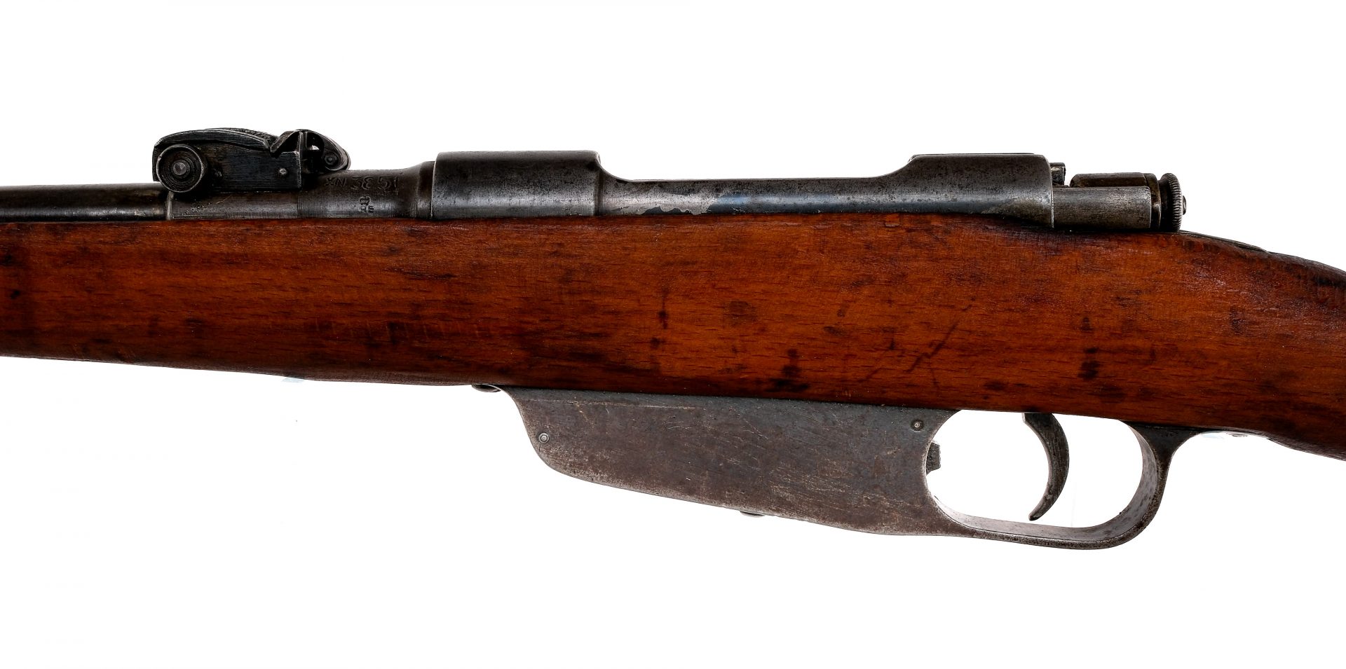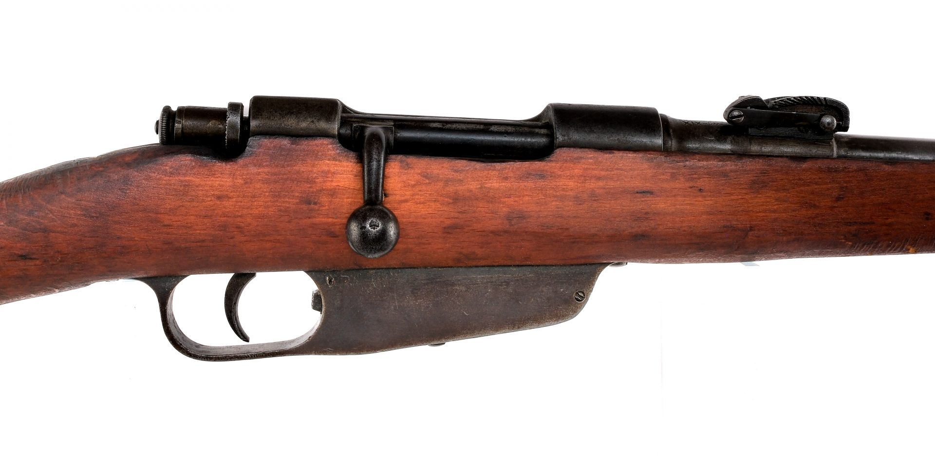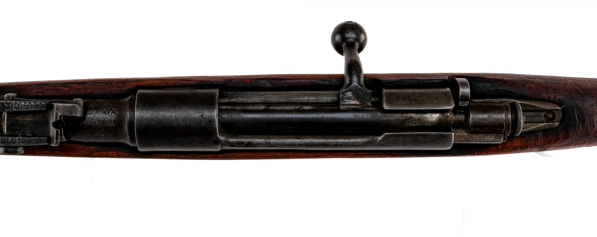 Description FNA Brescia Model 1891 Calvary Carbine in 6.5x52mm with a six round capacity and a 18″ barrel. Metal butt plate with cleaning rod door, empty. Smooth wood stock. Finish worn blued trigger guard, trigger, receiver and barrel. Rear bolt safety. Rear flip up adjustable and front fixed blade sight. Top of receiver marked: 41-XIX FNA BRESCIA XN 3851 RE. Must ship to a C&R or FFL holder. Condition: Good with scratches, wood dings, finish wear/loss. Front fold out bayonet is missing and the front muzzle cap with sight has been replaced. Clean rifled bore. Barrel Length: 18″ Serial: N3851 Manufacturer: FNA Brescia Year: 1941 Caliber: 6.5x52mm Model: 1891 Calvary Carbine Book# 04339