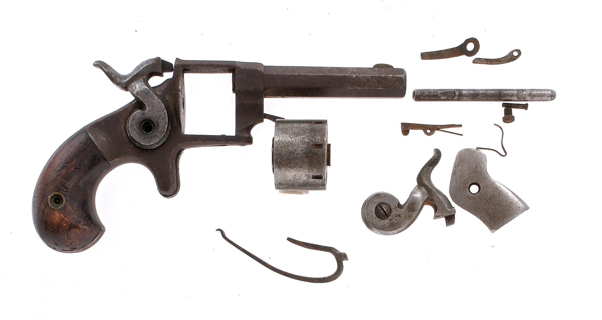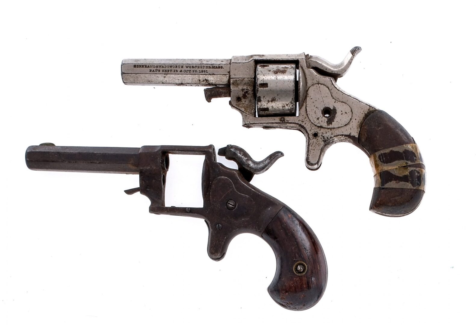 Description Estate lot with two Forehand & Wadsworth Side Hammer parts revolvers. In .22 Rimfire Short with a seven round capacity and a 2.25″ octagon barrel. Birds head smooth wood grip plates. One is nickel finished. Both have front fixed blade sights. Antique, No FFL required and ships to MOST buyers homes. Condition: Poor with scratches, finish wear/loss, broken/missing parts and rust/pitting. Both rifled bores have rust. Sold AS-IS. Barrel Length: 2.25″ Serial: 3170 11803 Manufacturer: Forehand & Wadsworth Caliber: .22 RF Short Model: Side Hammer