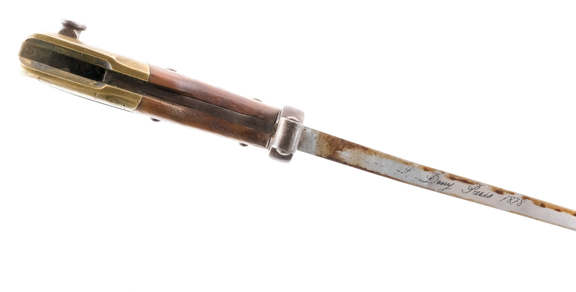 Description This lot is for one bayonet and scabbard. French Gras Model 1874 bayonet made by L. Deny in Paris in 1878. 20.5″ blade. 25.5″ length including handle. 26″ overall length closed in scabbard. Matching low serial number on bayonet and scabbard: 120. Hooked quillon with Anchor proof on one side denoting either French Navy issue or Colonial Troop issue with this mark. Inspection proofs and serial number on reverse side. No FFL required and ships to buyers home. Condition: Good/Very Good with light touches of rust and handling wear. Serial: 120 Manufacturer: L Deny Year: 1878 Model: 1874