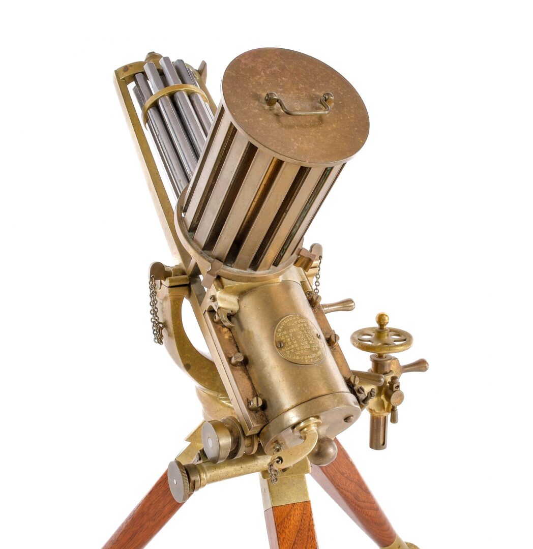 Description Rare and desirable Furr Arms model 1876 Camel fully functioning 1/3 scale gatling gun chambered in .22 long rifle with one Broadwell drum feeding mechanism and ten, 7″ nickel barrels. Mostly brass construction with walnut tripod legs. Gatlings Battery Gun plaque with original paten on the top of the receiver. The bottom is of the frame is marked “Made By Furr Arms Orem Utah May 1985”. Must ship to a FFL holder. Condition: Good/Very Good with some scratches and handling wear. The Brass and nickel parts could use some polishing. Clean bores. Barrel Length: 7″ Serial: 100 Manufacturer: Furr Arms Year: 1985 Caliber: .22 Long Rifle Model: 1876 Camel 1/3 Scale Book# 03435