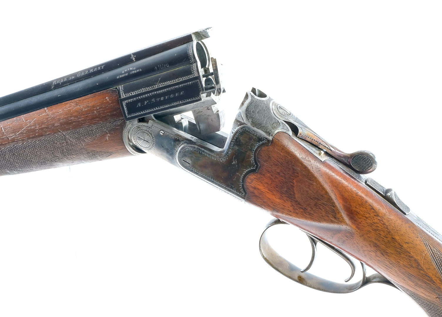 Description A.F. Stoeger imported German made combination gun with an over under shotgun/rifle. Upper barrel is 28ga shotgun, Under barrel is 6.5x52R (similar to 25-35 win) Serrated butt plate. Checkered Monte Carlo style stock and front foregrip. Case colored engraved trigger guard, checkered top lever and receiver. Double trigger. Blued over under barrel. Rear express sights and front fixed blade sight. Rear tang slide button safety. Must ship to a C&R or FFL holder. Condition: Good/Very good with light finish wear/loss and scuffs. The butt plate is repaired from a crack. Clean rifled and smooth bore. Barrel Length: 26.5″ Serial: 2029 Manufacturer: Stoeger / Unk Gauge: 28 Caliber: 6.5x52R Model: Rifle/Shotgun