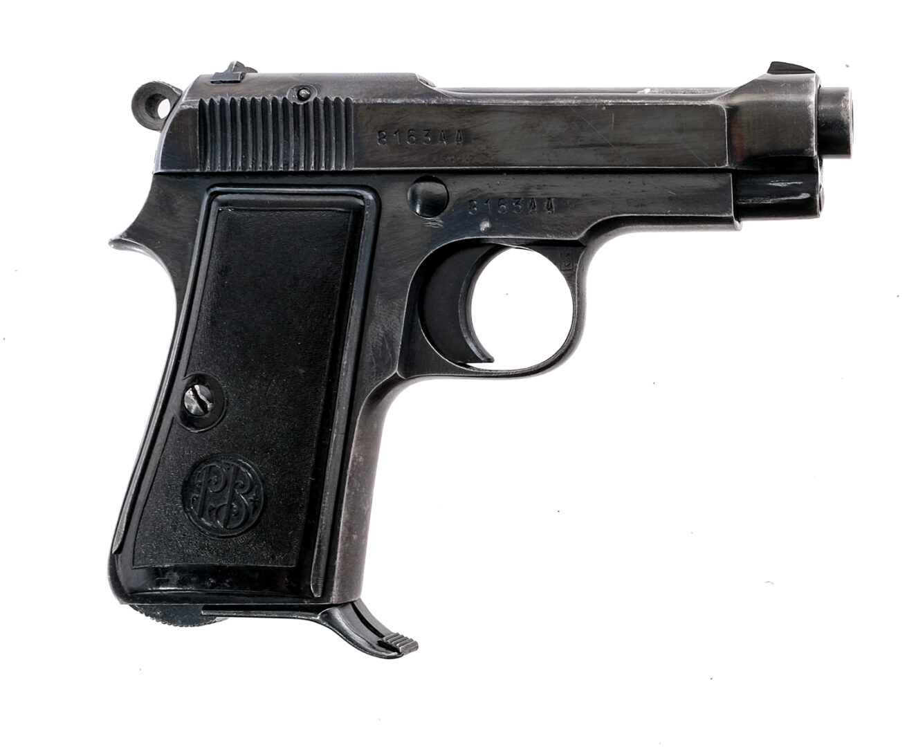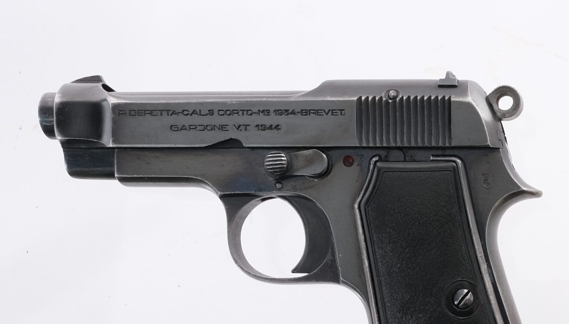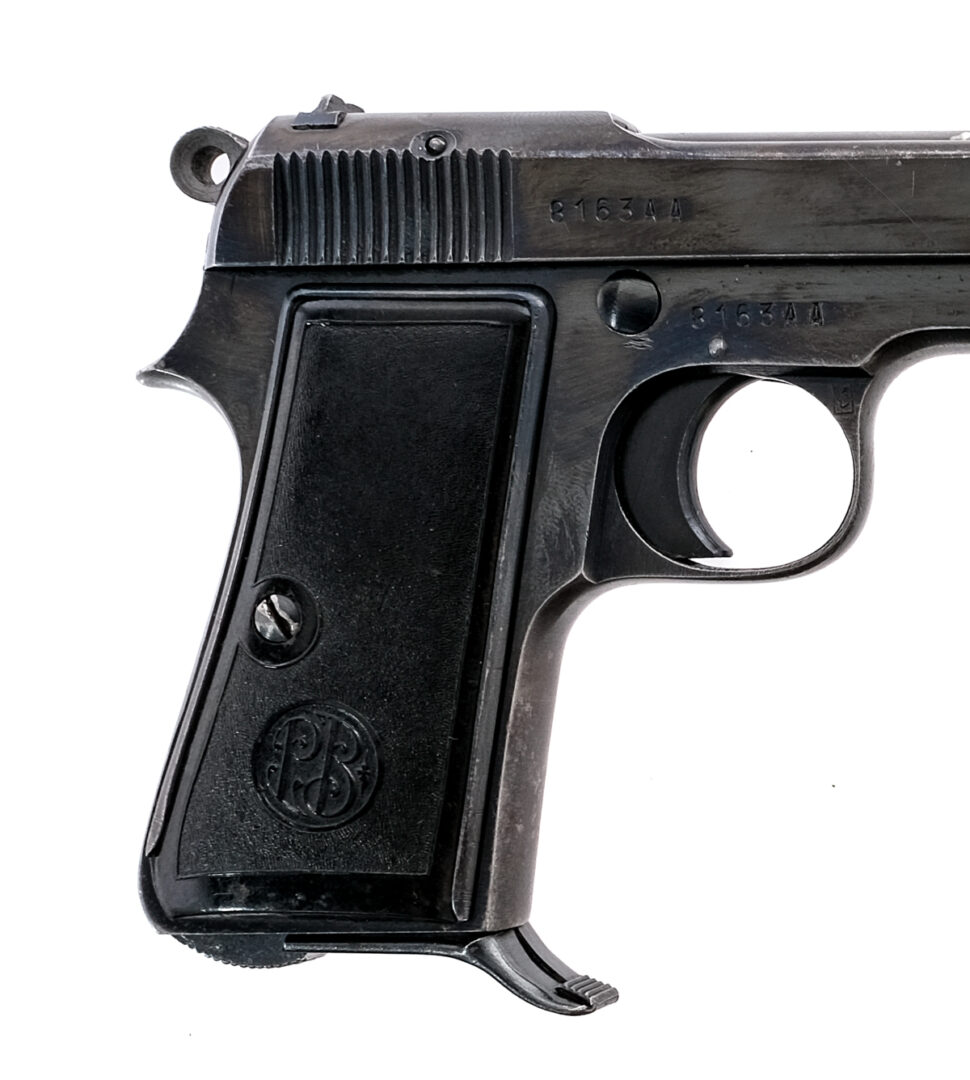 Description Beretta 1934 chambered in .380 caliber with one, seven round removable magazine and a 3.7″ barrel. Manufactured in 1944 with serial number 8163AA produced for occupying German forces. Blued steel frame with black composite Beretta grips. Heel magazine release, lanyard loop, and frame mounted manual safety. Single action trigger with exposed serrated hammer. Blued barrel and serrated slide. integral iron sights. Matching frame and slide. Non import marked. Brescia proof house mark on the left side of the frame. Boxed “[MA]” on the right side of the trigger guard. Must ship to FFL or C&R holder. Condition: Good/Very good with scratches, light finish wear/loss, patina, and light spots of metal oxidation. Most of the finish loss is on the sharp edges, near the muzzle, and on the front and backstrap. Clean rifled bore. Barrel Length: 3.7″ Serial: 8163AA Manufacturer: BERETTA Year: 1944 Caliber: .380 ACP Model: 1934 Book# 01792