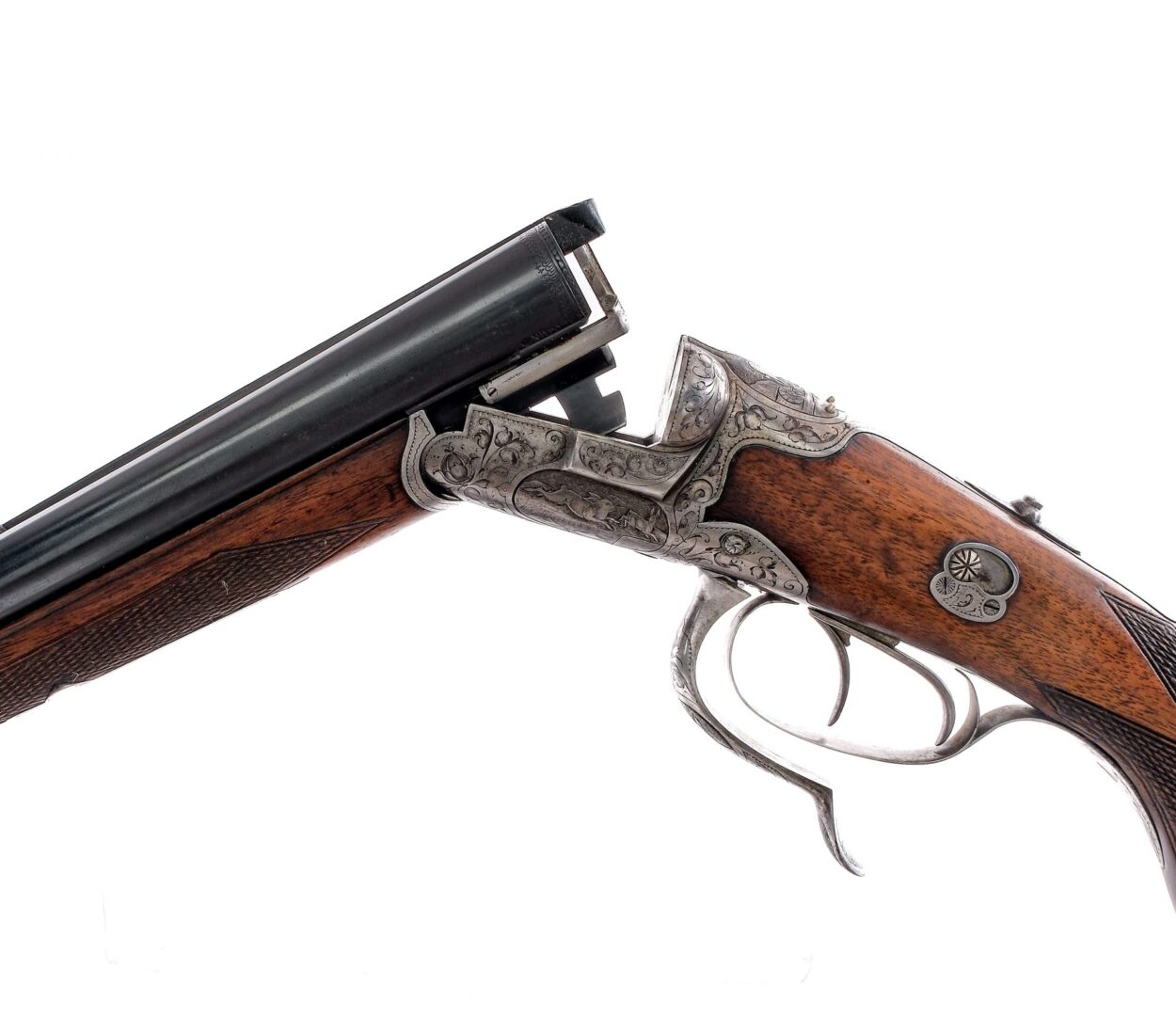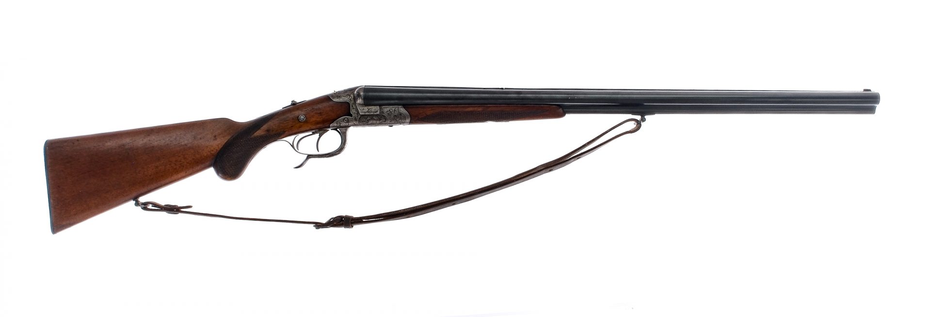 Description Unknown manufacturer and most likely a guild system assembly, three barrel Drilling combination gun. This is configured with 16 gauge side by side shotgun barrels choked FULL over a 7.7mm rifled barrel. The nitro proofed barrels measure 26-3/4″ with solid rib, fixed front blade, dove tail u-notch rear sight cleverly operated by the tang switch, finely engraved receiver with game scenes on either side and on the release lever, chamber indicators, side safety switch, double trigger, and diamond checkered hardwood forend and stock with raised cheek. Ships to FFL/C&R only. Condition: Excellent overall condition with very little finish loss on the barrels. The engraving is crisp showing a nicely aged patina. The stocks show scattered and light marks from handling. The bores are bright, the rifled barrel showing good rifling, and the lockup is tight. Barrel Length: 26-3/4″ Serial: 34403 Manufacturer: Unknown Gauge: 16 Year: Unknown Caliber: 7.7mm Model: Drilling