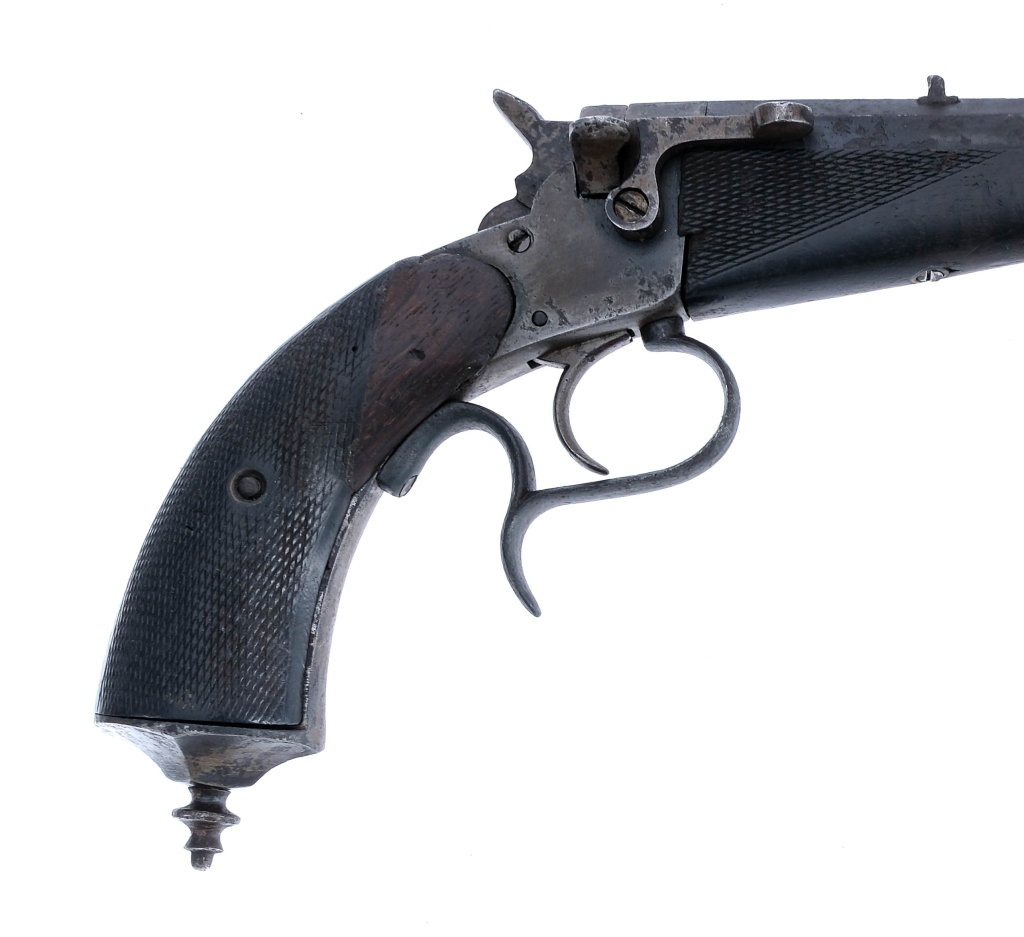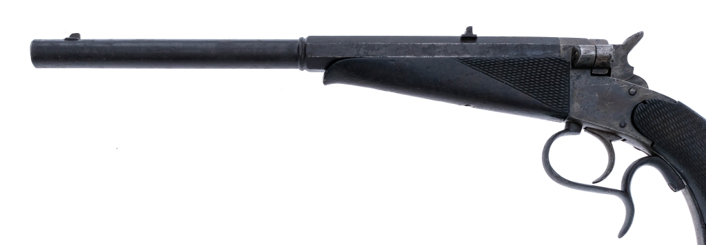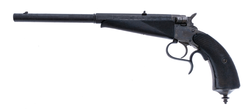 Description German Target Pistol in .22 caliber with a single round capacity and a 10.5″ barrel. Unknown maker. Checkered wood grip plates and Schnabel style front forend. Finish worn trigger guard, frame, hammer and barrel. Right side of frame breech door and extractor lever. Rear notch and front fixed sight. German proofs on the underside of barrel. Antique, No FFL required and ships to MOST buyers home. Condition: Antique, Fair with scratches, rust/pitting, grip plate damage, finish wear/loss and handling wear. The rifled bore has rust. Barrel Length: 10.5″ Serial: 611 Manufacturer: Germany Caliber: .22 Model: Target Pistol Year-Range 1880-1898