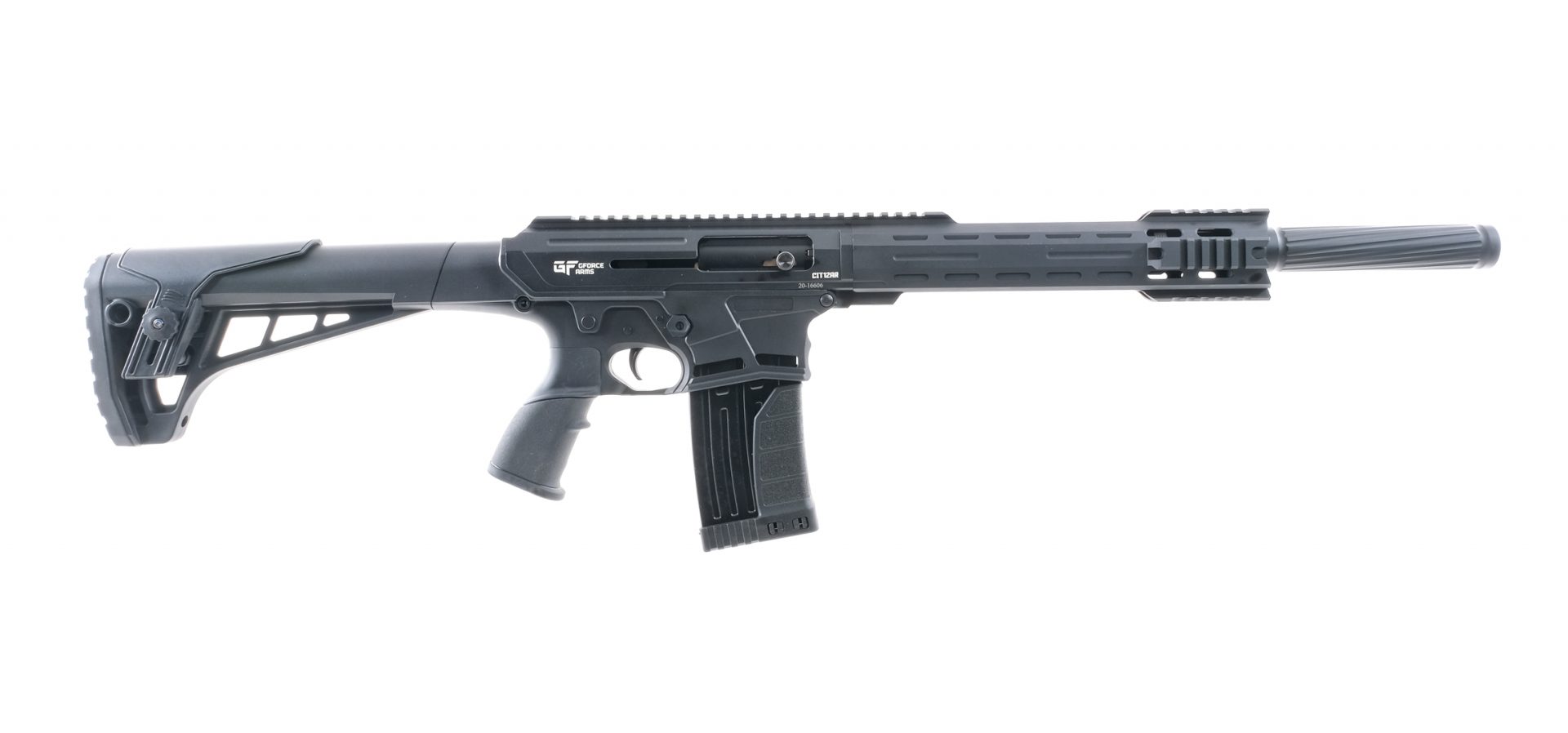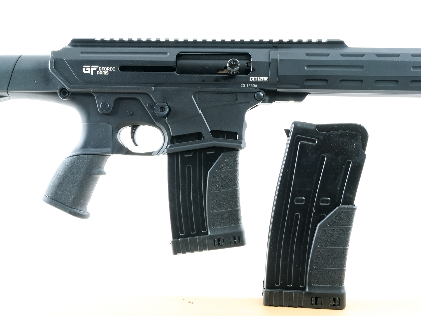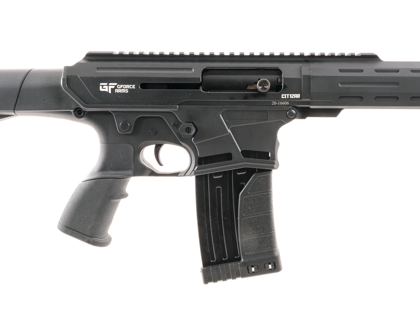 Description GForce Arms 12AR chambered in 12 gauge with two, five round removable magazines and a 18.5″ MOD choke threaded barrel. Gas operated and chambered for 3″ shells. Black finished aluminum upper receiver with flat top picatinny rail. Aluminum hand guard with five picatinny mounting points. AR style bolt catch/release and safety selector. Composite stock with rubber butt pad and adjustable cheek riser. Rubber pistol grip with thumb rest and finger grooves. Comes in factory box with matching serial number, instruction manual, adjustable iron sights, extra choke, and two magazines. Must ship to FFL holder. Condition: New in box. Barrel Length: 18.5″ Serial: 20-16606 Manufacturer: GForce Arms Gauge: 12 Ga. Model: 12AR Book# 8-275