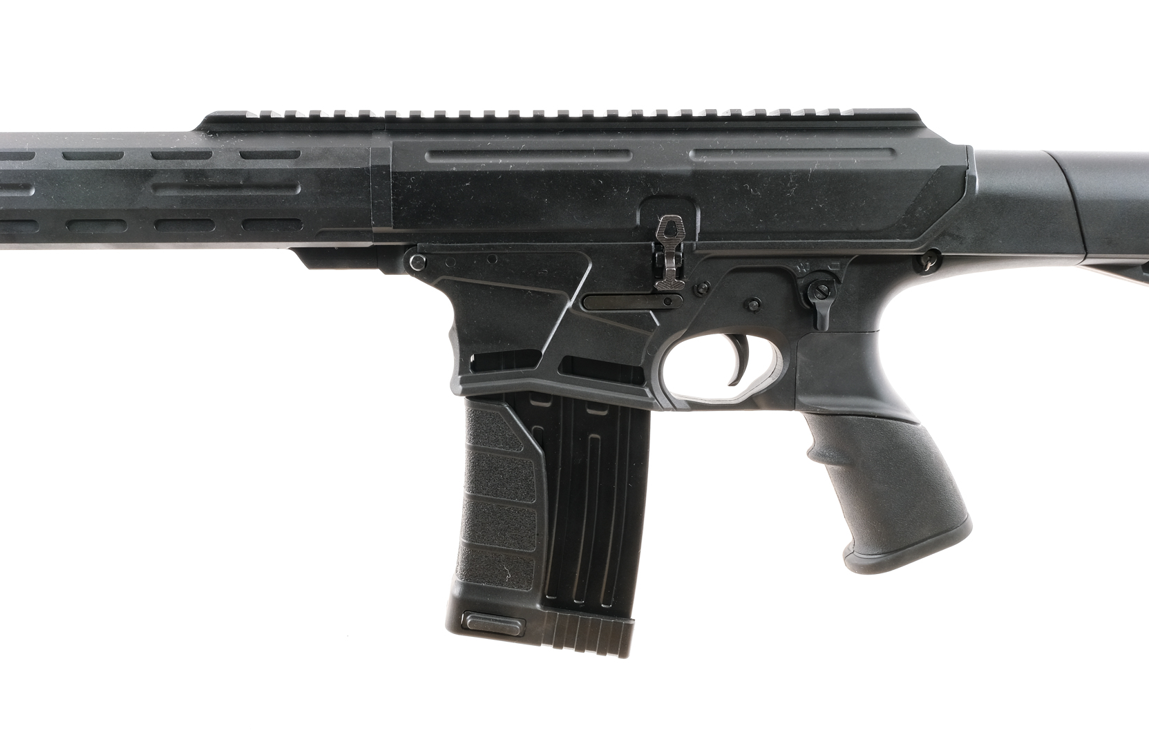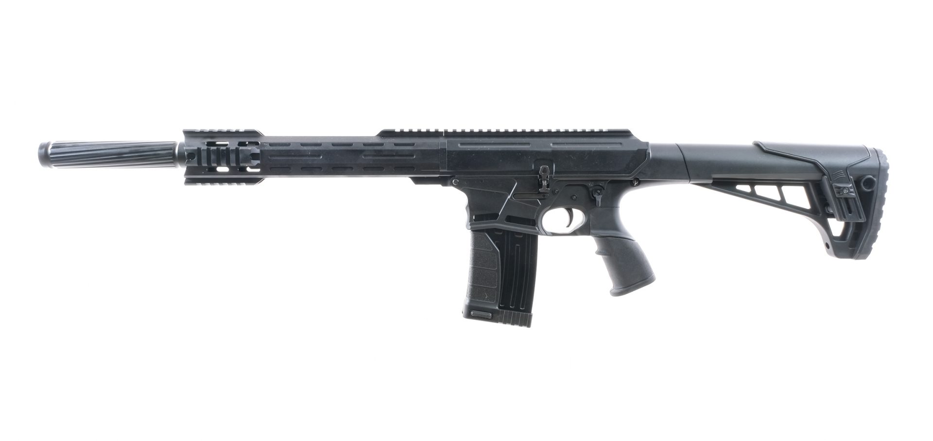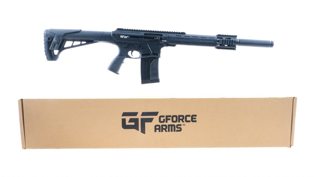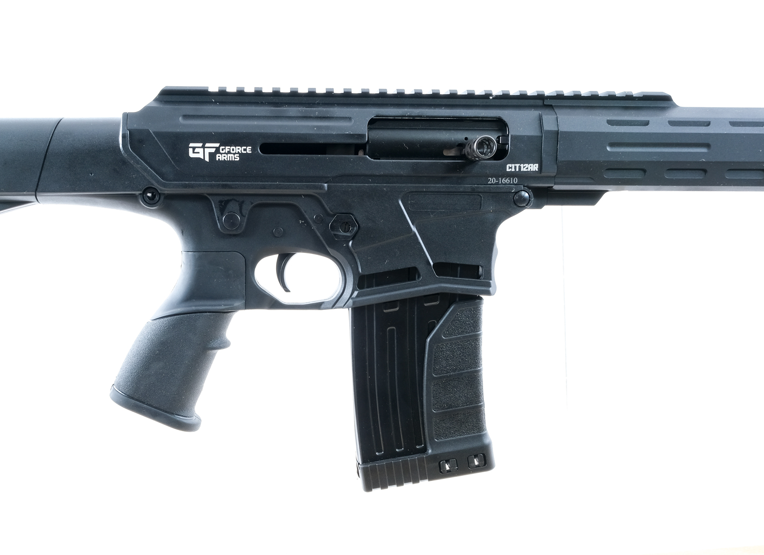 Description GForce Arms 12AR chambered in 12 gauge with two, five round removable magazines and a 18.5″ MOD choke threaded barrel. Gas operated and chambered for 3″ shells. Black finished aluminum upper receiver with flat top picatinny rail. Aluminum hand guard with five picatinny mounting points. AR style bolt catch/release and safety selector. Composite stock with rubber butt pad and adjustable cheek riser. Rubber pistol grip with thumb rest and finger grooves. Comes in factory box with matching serial number, instruction manual, adjustable iron sights, and two magazines. Must ship to FFL holder. Condition: New in box. Barrel Length: 18.5″ Serial: 20-16610 Manufacturer: GForce Arms Gauge: 12 Ga. Model: 12AR Book# 8-276