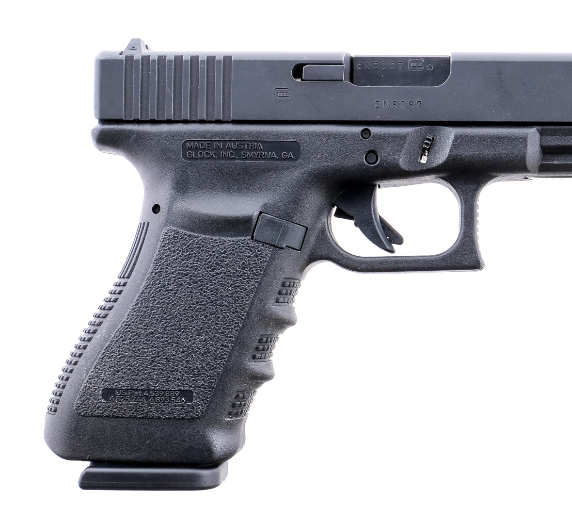 Description Glock 20 Gen 3 in 10mm with one, fourteen round removable magazine and a 4.5″ barrel. Textured grip on composite frame. Composite trigger with depression safety. Blued serrated metal slide and barrel. Lower left side of frame serrated magazine release button. Left side of frame serrated slide release. Front and rear fixed white sights. Must ship to a FFL holder. Condition: Very Good/Excellent with light scuffs and handling wear. Clean rifled bore. Barrel Length: 4.5″ Serial: CNS287US Manufacturer: Glock Caliber: 10mm Model: 20 GEN 3 Book# 9-764