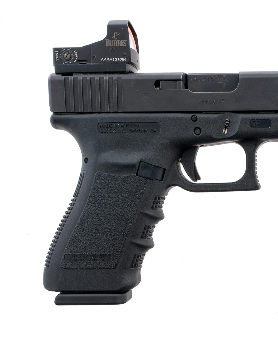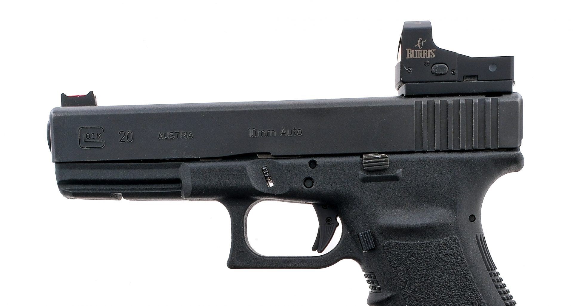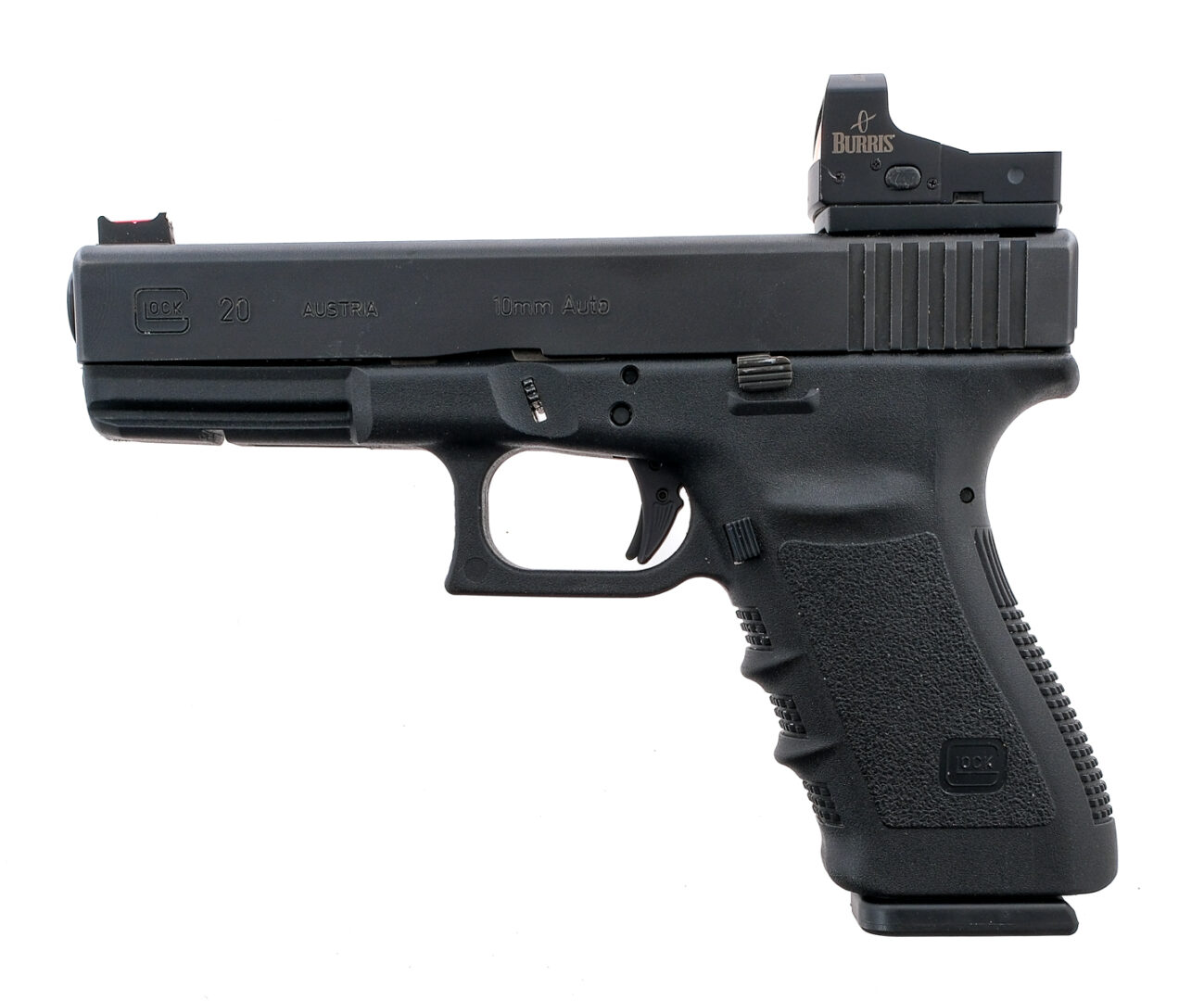 Description Glock 20SF chambered in 10mm Auto with three, fifteen round magazines and a 4.61″ barrel. Fully textured short frame with under barrel accessories rail. Serrated magazine release and slide catch. Polymer trigger with trigger safety. Serrated slide with white painted red fiber optic front blade and optics cut with Burris FastFire 3 red dot sight. Comes in its factory box with factory paperwork, cable lock, magazine loader, and three magazines. Must ship to FFL holder. Check local laws regarding “High Capacity” magazines BEFORE bidding. Condition: Very Good with light wear from handling and operation. Clean rifled bore. Barrel Length: 4.61″ Serial: NHL615 Manufacturer: GLOCK Caliber: 10mm Auto Model: 21SF Book# 02121