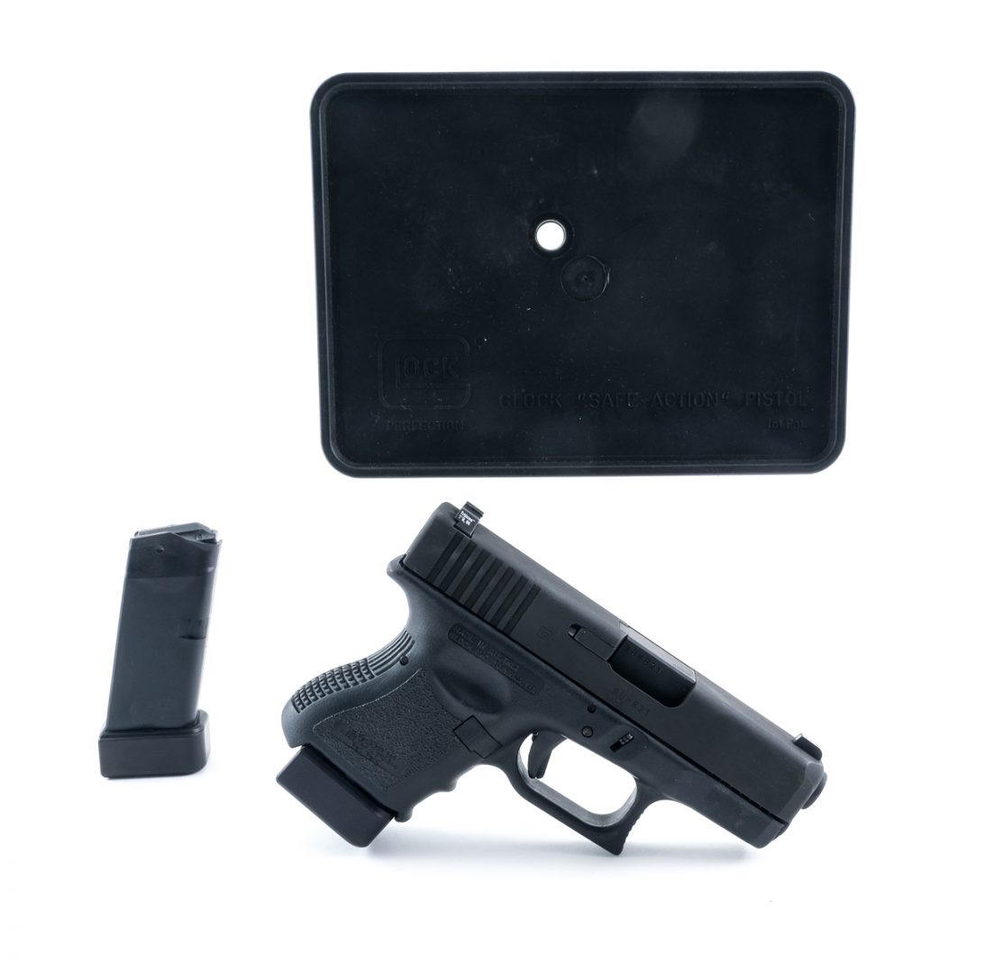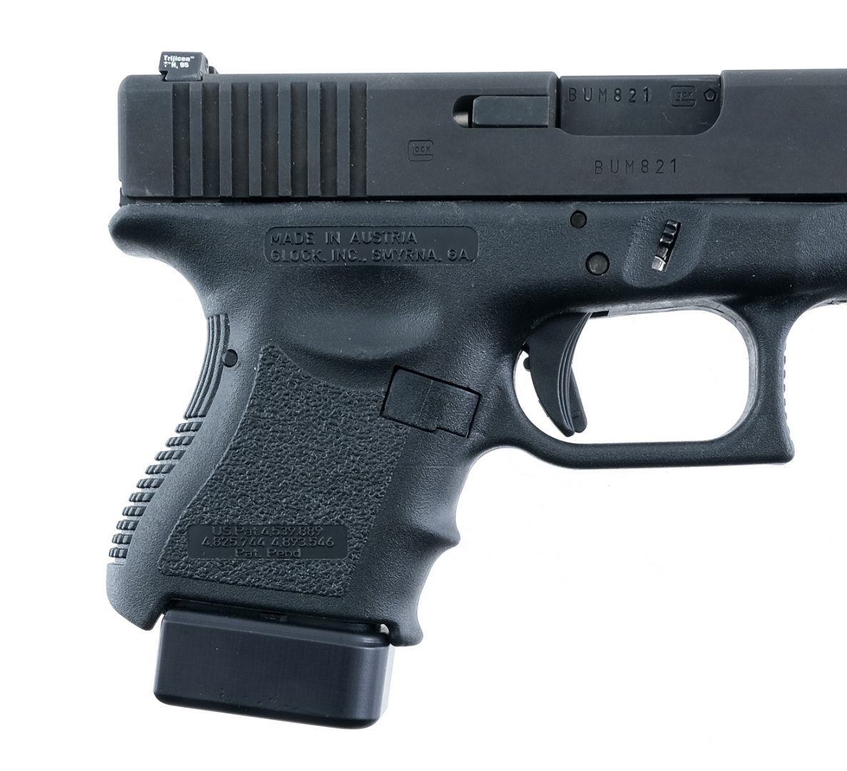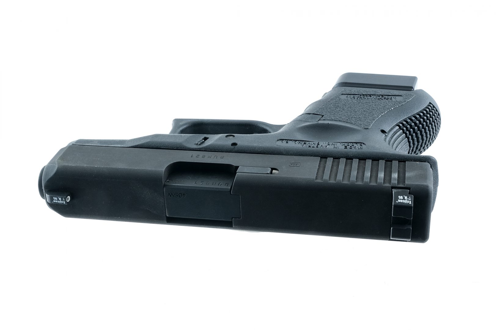 Description Glock 27 Gen 3 in .40 Smith & Wesson with two, nine round removable magazines and a 3 1/4″ barrel. Textured grip on black composite frame. Black finished serrated metal slide. Serrated composite trigger with depression safety. Left side of frame serrated slide release. Lower left side of frame serrated magazine release button. Mid-frame serrated ambidextrous take-down button. Trijicon T H 95 white dot night sights. Comes in its factory hard case (Tupperware) with matching serial number, speed loading device, cleaning rod and brush, original fixed sights, instruction manual and two magazines with aftermarket floor plates. Must ship to a FFL holder.