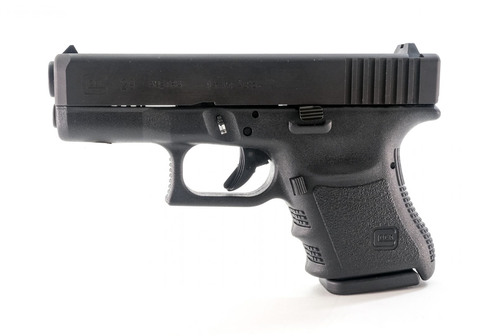 Description Glock 29 Gen 2 in 10mm with (2) ten round removable magazines and a 3.5″ barrel. Made in Austria. Without the front rail and with the finger grooves on the grips this is considered by many to be a (2.5) Generation. Dimpled grip on composite frame. Black finished metal serrated slide. Fixed white dot sights. Left side of frame serrated slide release. Left side of grip serrated magazine release button. Serrated composite trigger with depression safety. Includes factory container with matching serial number, cleaning brush and rod, speed loading device and two magazines. Must ship to a FFL holder.