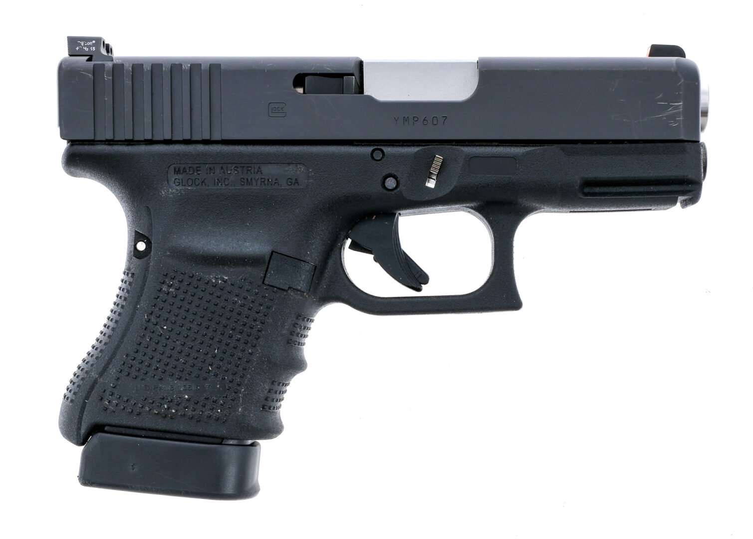 Description Glock 30 Generation 4 in .45 ACP with three, ten round removable magazines and a 3.75″ aftermarket performance barrel. Textured black composite grip on frame. Serrated composite trigger. Blued serrated slide. Left side of frame serrated magazine release and aftermarket slide release. Rear slide plate is aftermarket with American Flag. Front and rear fixed Trijicon sights. Comes in its serial number matching case with instruction manual, fist round test fired and three magazines. Must ship to a FFL holder. Condition: Very Good/Excellent with light scuffs and handling wear. Clean rifled bore. Barrel Length: 3.75″ Serial: YMP607 Manufacturer: Glock Caliber: .45 ACP Model: 30 Gen 4 Book# 06479