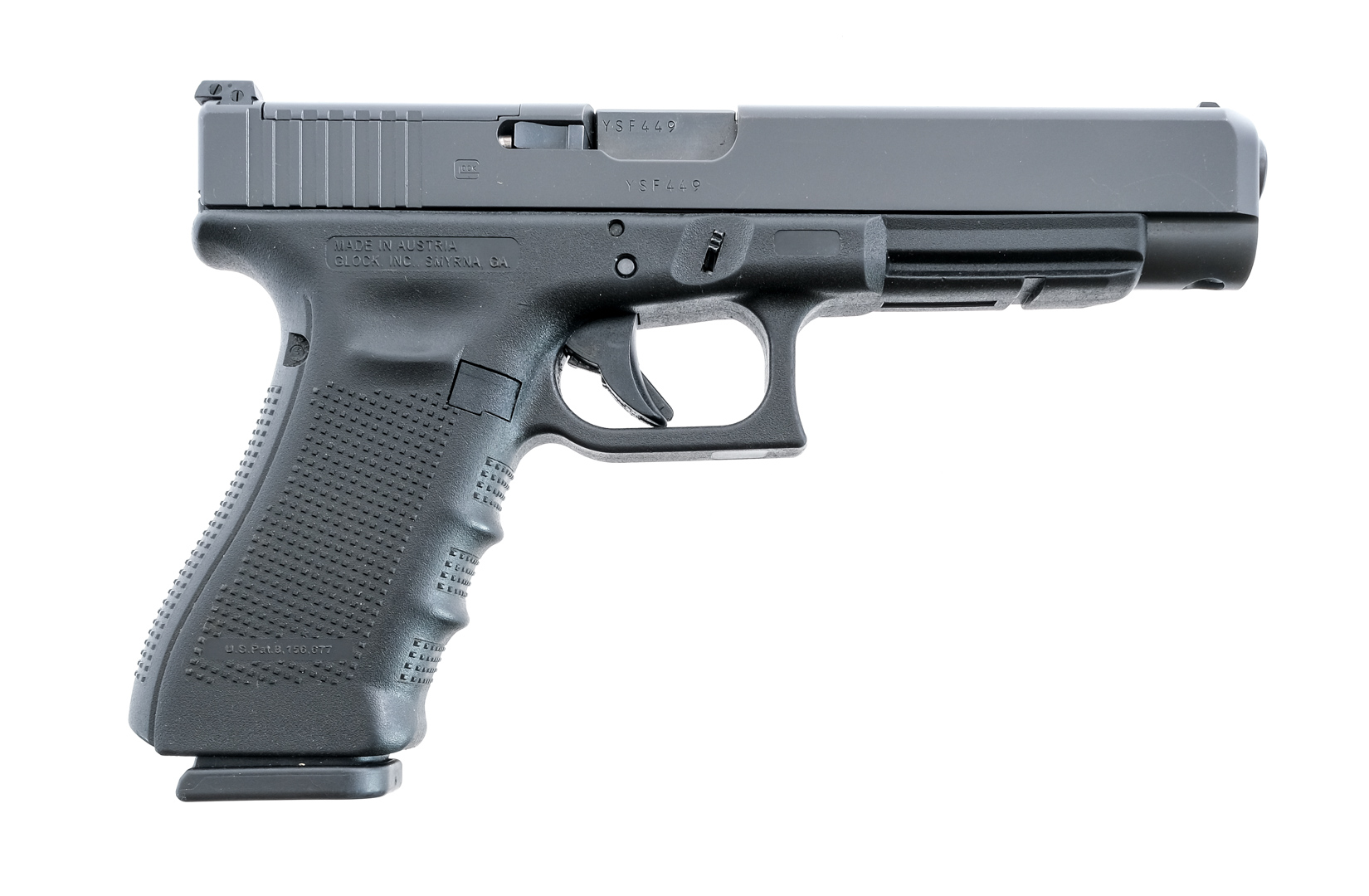 Description Glock 34 Generation 4 in 9mm with three, ten round removable magazines and a 5″ barrel. Textured grip on composite frame. Composite trigger with depression safety. Ported serrated metal slide. Left side of grip serrated magazine release. Left side of frame slide release. Front and rear fixed sights. Slide has optics rail and comes with different slide plates for mounting. Comes with its factory hard case with matching serial number, instruction manual, first round fired, four interchangeable backstraps, three magazines, cleaning brush, optics plates and first round factory test fired. Must ship to a FFL holder. Condition: Like new with light handling wear. Clean rifled bore. Barrel Length: 4″ Serial: YSF449 Manufacturer: Glock Year: 2015 Caliber: 9mm Model: 34 Gen 4