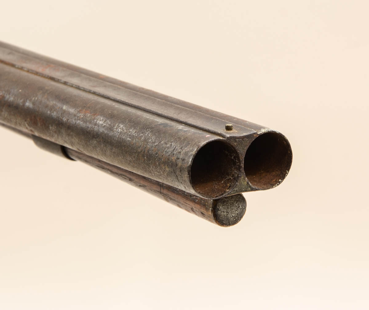 Attic find. Antique English Double Barrel Shotgun. Hammers and triggers function well. No repairs, no dings in barrels. Bores are pitted and in poor shape. Furniture dark, stained, etc. Muzzle measures .8″+- (Cylinder Bore) Antique.