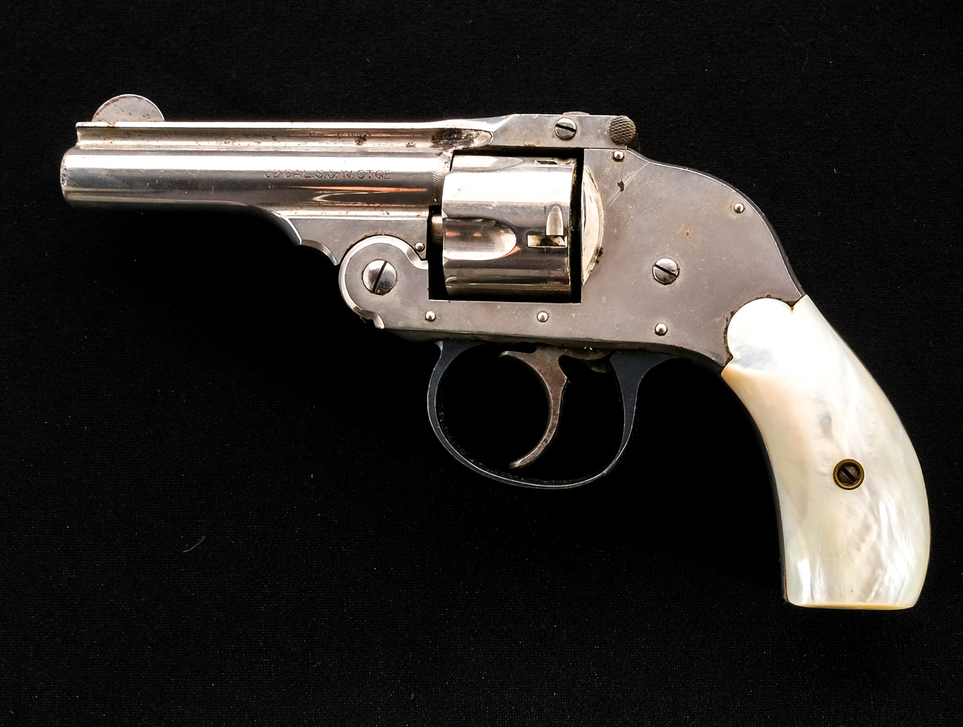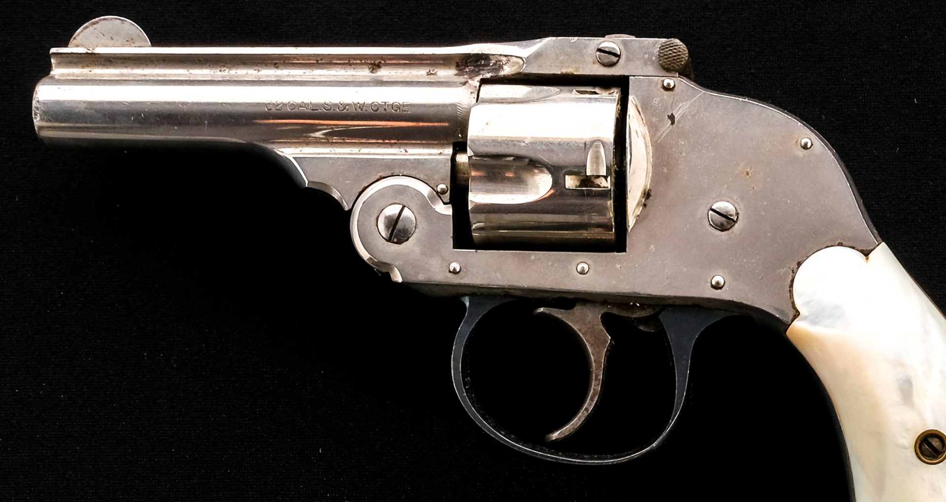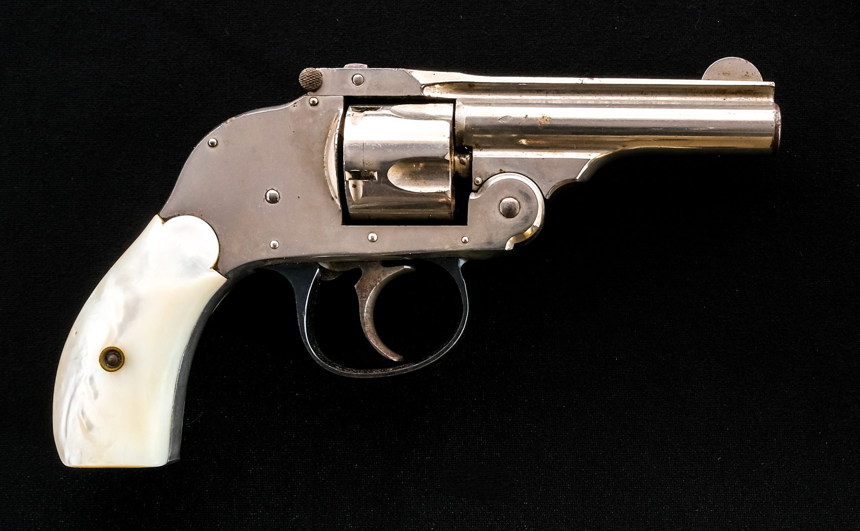 Description Harrington & Richardson top break hammerless in .32 Smith & Wesson with a five round capacity and a 3″ barrel. Rear mother of pearl grip plates. Nickel plated frame, cylinder and barrel. Blued trigger guard. Case colored untextured trigger. Checkered top of frame action release. Must ship to a C&R or FFL holder. Condition: Good with scratches, finish wear/loss and touches of rust. The rifled bore has rust with visible rifling. Barrel Length: 3″ Serial: 115946 Manufacturer: Harrington & Richardson Caliber: .32 S&W Model: Top Break Book# 9-414
