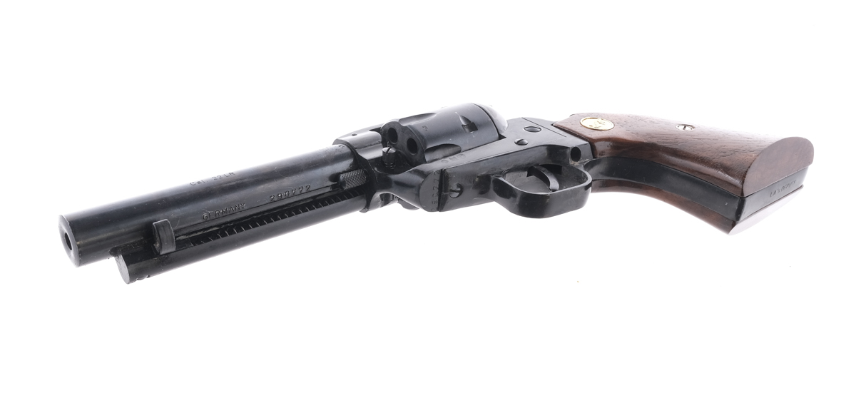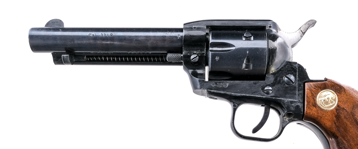 Description Herbert Schmidt LA ‘s Deputy in .22 Long Rifle with a six round capacity and a 4 3/4″ barrel. Smooth solid wood grip plates. Black finished trigger guard and frame. Blued trigger, serrated hammer, cylinder and barrel. Under barrel checkered cylinder release pin and extraction rod. Front fixed blade sight. Comes in a mismatched ROHM box with instruction manual for Rohm and cleaning brush. Must ship to a C&R or FFL holder. Condition Poor, action does not function correctly. Sold AS-IS. Barrel Length: 4.75″ Serial: 290772 Manufacturer: HERBERT SCHMIDT Year: 1967 Caliber: .22 LR Model: LA’s Deputy Book# 10-654