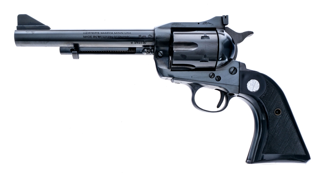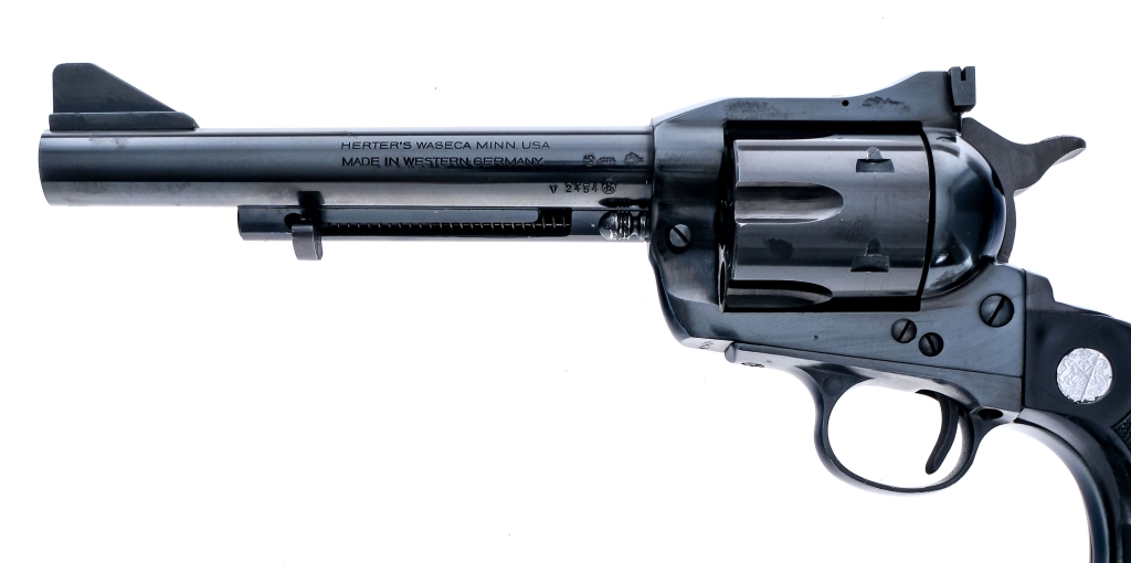 Description Herter’s Single in .401 Herter Powermag with a six round capacity and a 6.5″ barrel. Manufactured in West Germany in 1965 and imported by Herter’s in Waseca, Minnesota. Checkered composite grip plates. Black finished frame, cylinder, barrel and ejection rod housing. Fixed iron sights. Serrated hammer and smooth trigger. Right side of cylinder loading gate. Must ship to C&R or FFL holder Condition: Good with light scratches and heavier scratches to the base pin from a tool. Clean rifled bore. Barrel Length: 6.5″ Serial: V2454 Manufacturer: Herters Year: 1965 Caliber: .401 Herters Powermag Model: Single Book# 08440