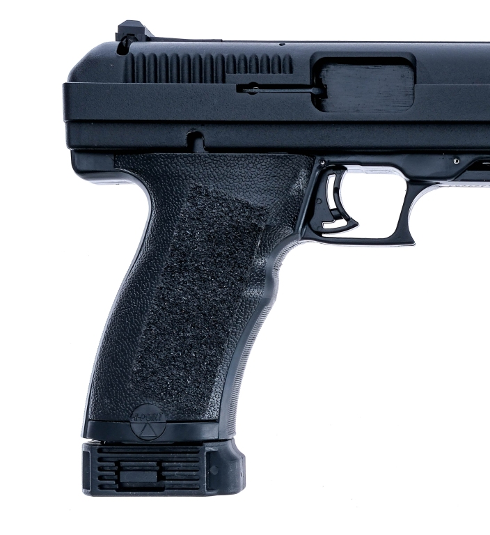 Description Hi-Point JHP chambered in .45 ACP with two, nine round removable magazines and a 4.5″ barrel. Textured polymer frame with under barrel accessories rail. After market grip tape installed on both sides of the grips. Frame mounted manual thumb safety and magazine disconnect safety. Black finished serrated side with three-dot adjustable rear sight and fixed front blade. Comes in its factory box with two magazines. Must ship to a FFL holder. Condition: Very Good/Excellent with light handling and operational wear. Bright and clean rifled bore. Barrel Length: 4.5″ Serial: X4329283 Manufacturer: HI-POINT FIREARMS Caliber: 9x19mm Parabellum Model: JHP Book# 07613